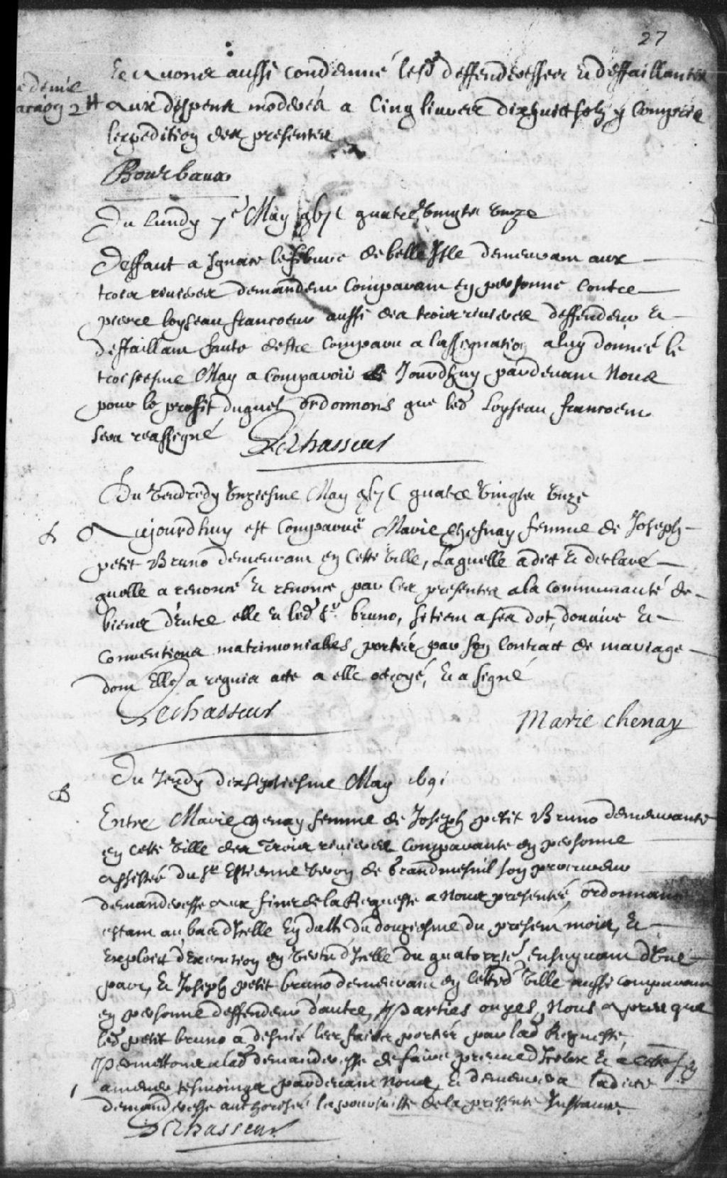 Comparution de Marie Chesnay (Chenay, Chenêt), femme de Joseph Petit Bruno (Bruneau), demeurant à Trois-Rivières, pour déclarer qu'elle a renoncé et renonce à la communauté de biens d'entre elle et ledit sieur Bruno pour s'en tenir à sa dot, son domaine et les conventions matrimoniales portées par son contrat de mariage dont elle a requis acte à elle octroyé