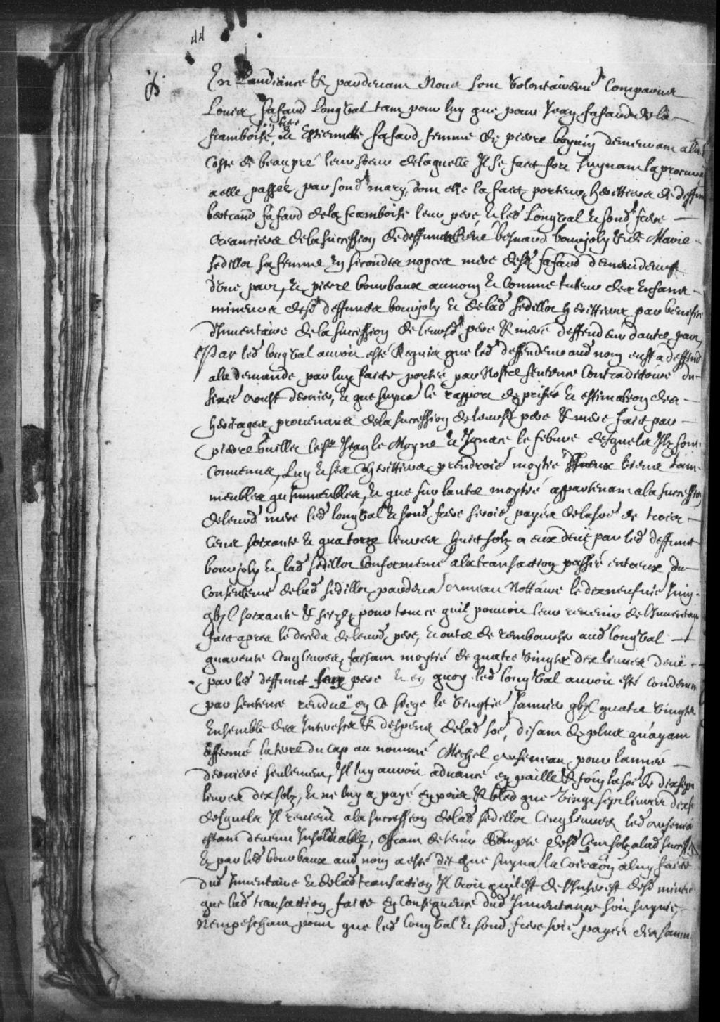 Le titre complet de la pièce se lit comme suit : Instance entre Louis Fafard de Longval, tant pour lui que pour Jean Fafard de la Framboise (Laframboise), son frère, Étiennette Fafard, femme de Pierre Boyvin (Boivin), demeurant à la côte de Beaupré, leur soeur, héritiers du défunt Bertrand Fafard de la Framboise (Laframboise), leur père et créanciers de la succession des défunts René Besnard (Bénard) de Bourjoly et Marie Sedillot (Sédilot), sa femme en secondes noces et leur mère, demandeurs, à l'encontre de Pierre Bourbaux (Bourbeau), au nom et comme tuteur des enfants mineurs desdits défunts Bourjoly et Sedillot, héritiers par bénéfice d'inventaire de la succession de leur père et mère, défendeur. Le sieur de Longval réclame la somme de 374 livres et 8 sols qui est due aux héritiers par les défunts Bourjoly et Sedillot conformément à la transaction passée entre eux du consentement de ladite Sedillot, par-devant le notaire Ameau, le 19 [...]