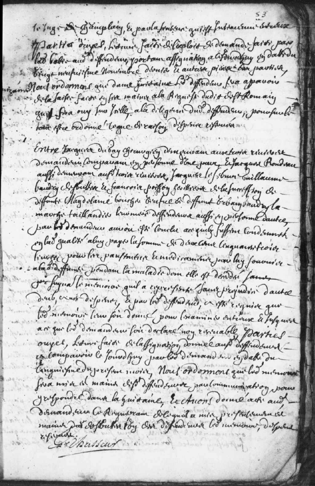 - Requête de Jacques Dugay (Duguay), demandeur, à l'encontre de Jacques Rondeau, Jacques Lefebvre, Guillaume Baudry (Beaudry) Desbuttes et François Poisson, héritiers de la succession de la défunte Madeleine Boucher, défendeurs...