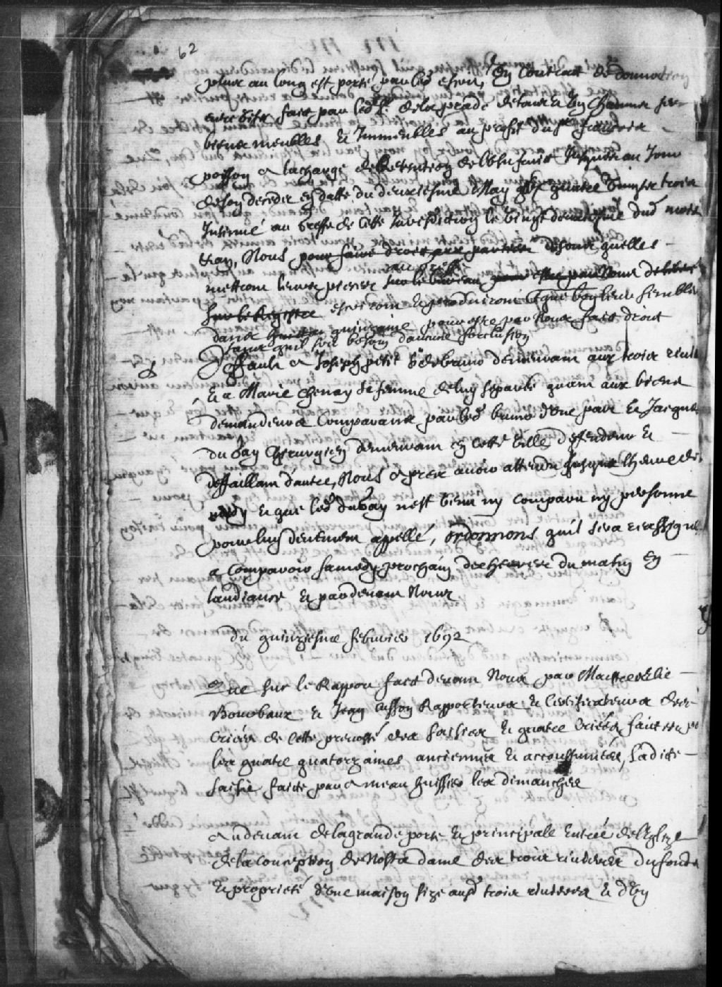 Défaut accordé à Joseph Petit Bruno (Bruneau), demeurant à Trois-Rivières, et à Marie Chenay (Chênet), sa femme de lui séparée quant aux biens, comparaissant par ledit sieur Bruno, demandeurs, à l'encontre de Jacques Dugay (Duguay), chirurgien demeurant à Trois-Rivières, défendeur. Ledit Dugay, défaillant, est réassigné à comparaître samedi prochain à 10 heures, 4 février 1692, Archives nationales à Trois-Rivières, Fonds Juridiction royale des Trois-Rivières, (04T,TL3,S11,P2337).