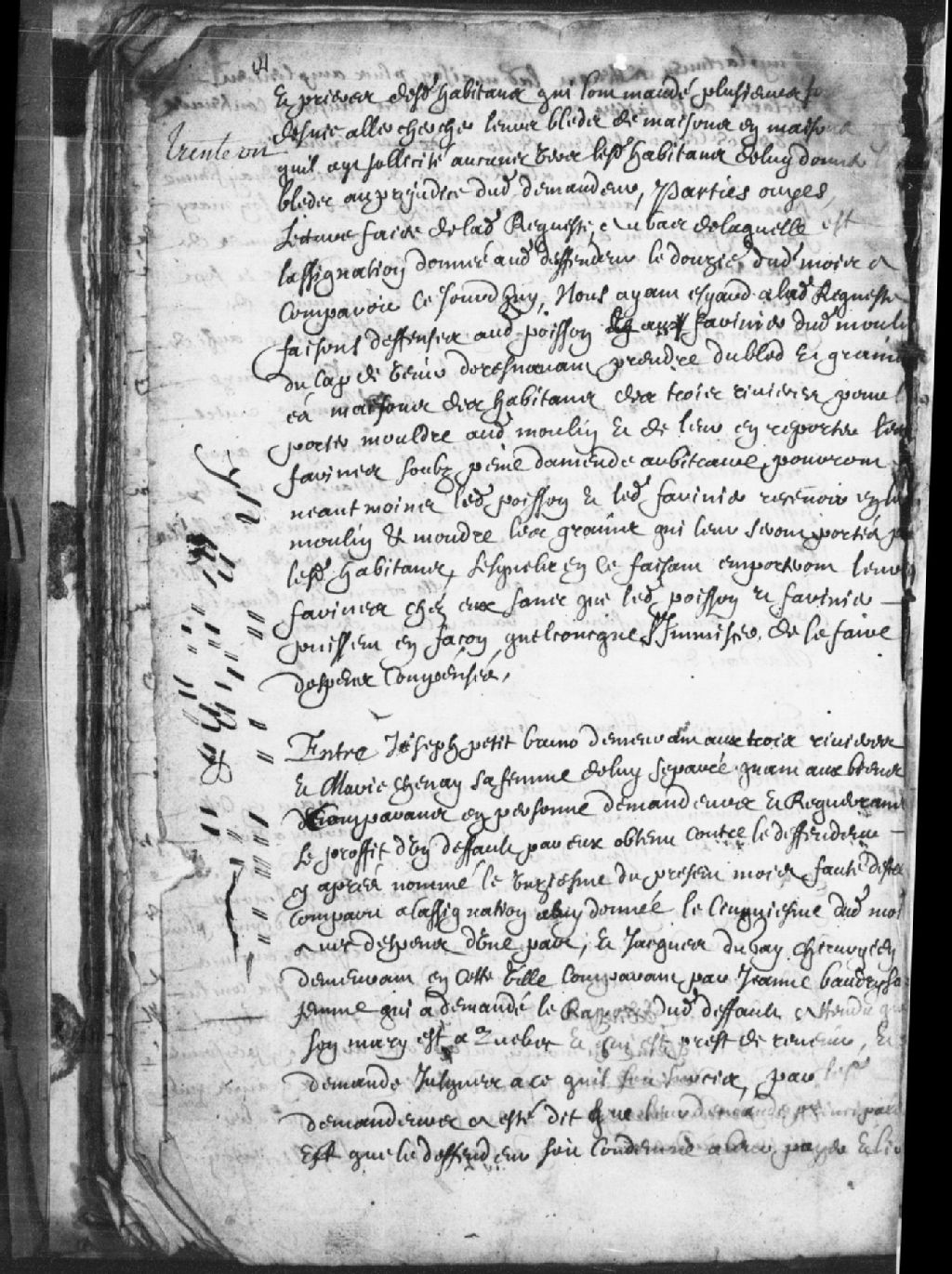 Requête de Joseph Petit Bruno (Bruneau), demeurant à Trois-Rivières, et Marie Chenay (Chenêt), sa femme de lui séparée quant aux biens, demandeurs, à l'encontre de Jacques Dugay (Duguay), comparaissant par Jeanne Baudry (Beaudry), défendeur..., 16 février 1692, Archives nationales à Trois-Rivières, Fonds Juridiction royale des Trois-Rivières, (04T,TL3,S11,P2341).