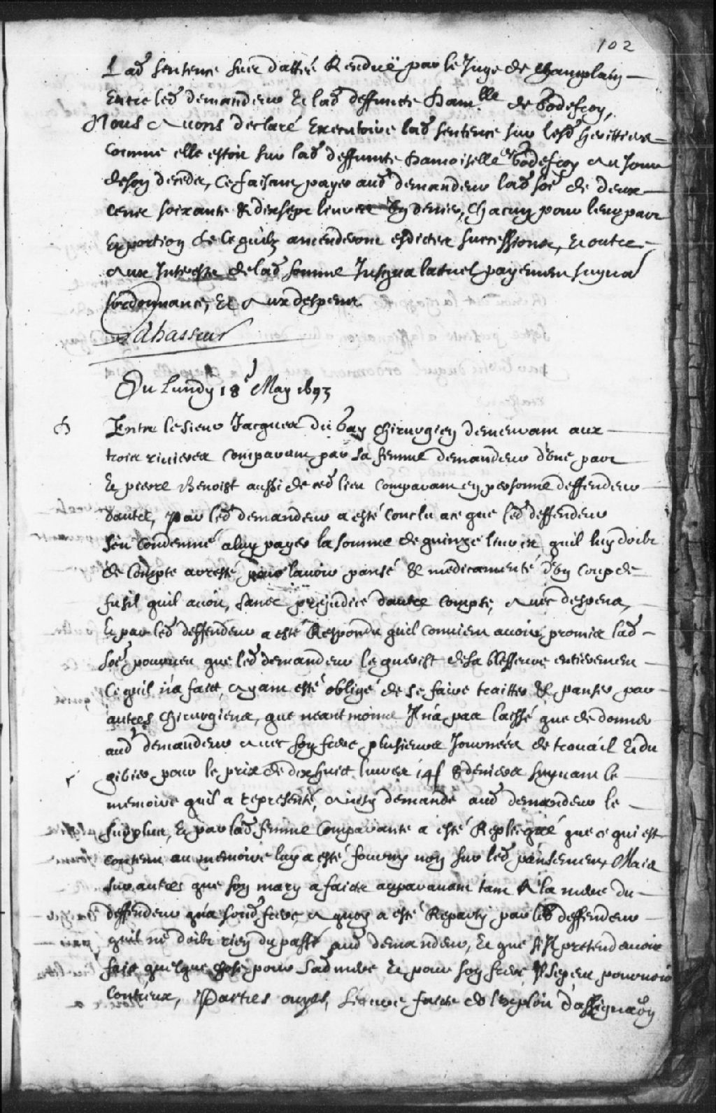 Requête de Jacques Dugay (Duguay), chirurgien demeurant à Trois-Rivières, comparaissant par sa femme, demandeur, à l'encontre de Pierre Benoist (Benoît), demeurant aussi à Trois-Rivières, défendeur..., 18 mai 1693, Archives nationales à Trois-Rivières, Fonds Juridiction royale des Trois-Rivières, (04T,TL3,S11,P2374).