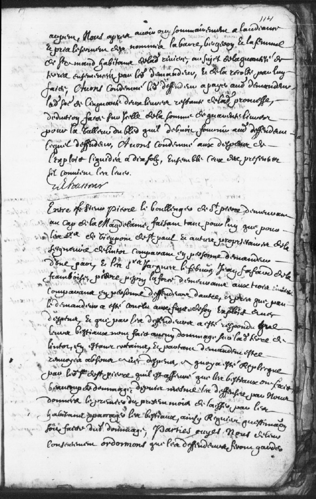 - Le titre complet de la pièce se lit comme suit : Requête de Pierre Leboullenger (Boulanger) de Saint-Pierre, demeurant au Cap-de-la-Madeleine, tant pour lui que pour les sieurs de Vieuxpont, de Saint-Paul et autres propriétaires de la seigneurie de Linctôt, demandeurs, à l'encontre de Jacques Lefebvre, Jean Fafard de La Framboise (Laframboise) et Pierre Pépin Laforce, demeurant à Trois-Rivières, défendeurs. Les défendeurs affirment que leurs bestiaux n'ont fait aucun dommage sur ladite terre de Linctôt alors que les demandeurs répliquent que les bestiaux ont fait beaucoup de dommages pour lesquels ils réclament qu'une estimation soit faite. Il est ordonné que lesdits défendeurs feront en sorte que leurs bestiaux ne feront aucun dommage. Pour l'estimation desdits dommages, le sieur de Saint-Pierre a nommé Nicolas Lecacheux (Cacheux), demeurant au Cap-de-la-Madeleine, alors que les défendeurs ont nommé Pierre Lemaistre (Lemaître).