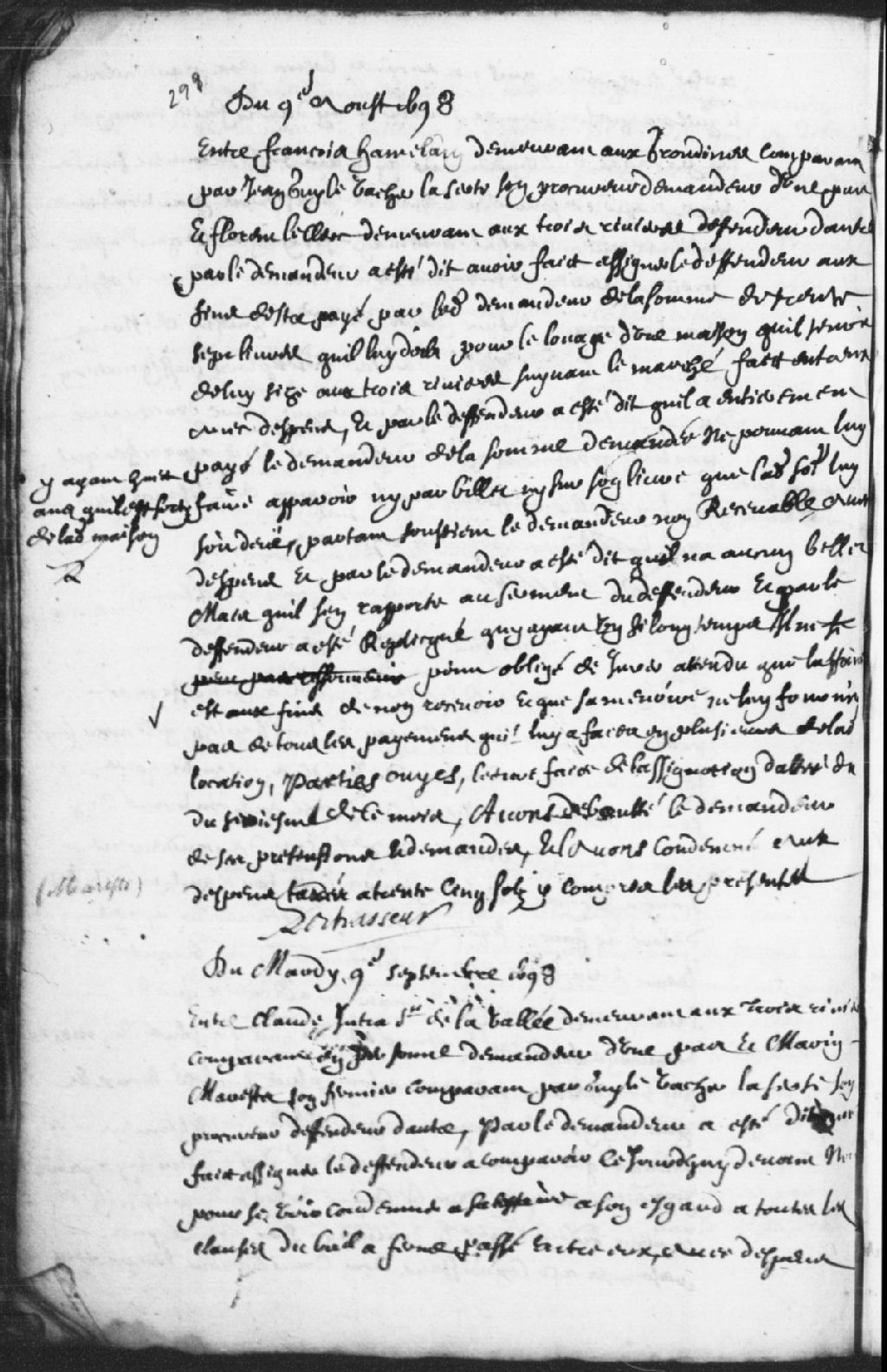 Requête de François Hamelin, demeurant aux Grondines, comparant par Jean-Guy Le Vacher, dit Laserte (Lacerte), son procureur, demandeur d’une part, à l’encontre de Fleurent Leclerc demeurant aux Trois-Rivières, défendeur d’autre part..., 9 août 1698, Archives nationales à Trois-Rivières, Fonds Juridiction royale des Trois-Rivières, (04T,TL3,S11,P2543).