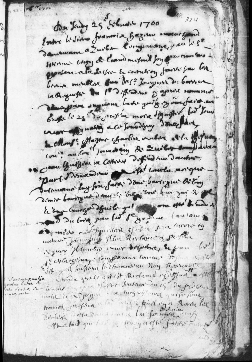 Requête du sieur François Hazeur, comparant par le sieur Étienne Veron de Grandmesnil, son procureur, demandeur, à l’encontre de maître Charles Aubert de la Chesnaye, comparant par huissier la Cettière, défendeur..., 25 février 1700, Archives nationales à Trois-Rivières, Fonds Juridiction royale des Trois-Rivières, (04T,TL3,S11,P2560).
