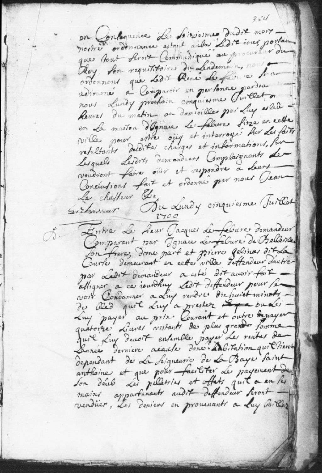 - Le titre complet de la pièce se lit comme suit : Requête de Jacques Lefebvre, comparant par Ignace Lefebvre, son frère, demandeur d¿une part, à l¿encontre de Pierre Gélinas dit Lacourse, demeurant en cette ville, défendeur d¿autre part. Le demandeur a fait assigner le défendeur pour le voir condamné à lui rendre ou à lui payer au prix courant 18 minots de blé prêtés audit défendeur, en plus de payer 14 livres restant d¿une plus grosse somme ainsi que les rentes de l¿année dernière d¿une habitation que le demandeur possède, dépendante de la seigneurie de la Baie-Sainte-Antoine, et que pour faciliter le paiement des sommes dues, les pelleteries et effets appartenant au défendeur, que le demandeur a entre ses mains, seront vendus jusqu¿à la concurrence de sa dette. Le défendeur a répondu qu¿il convient avoir emprunté lesdits minots de blé vers le temps de Noël de l¿année1698. Mention de Joseph Baudry (Beaudry) dit Lamarche. Le défendeur est condamné à payer au demandeur lesdits 18 minots de blé au prix de 3 livres le minot. De plus, les parties compteront ensemble à l¿amiable ce que le demandeur prétend lui être dû pour les 14 livres et les rentes seigneuriales, ce faisant le demandeur rendra les pelleteries et les effets audit défendeur qui est condamné aux dépens taxés à 33 sols, monnaie de France.
