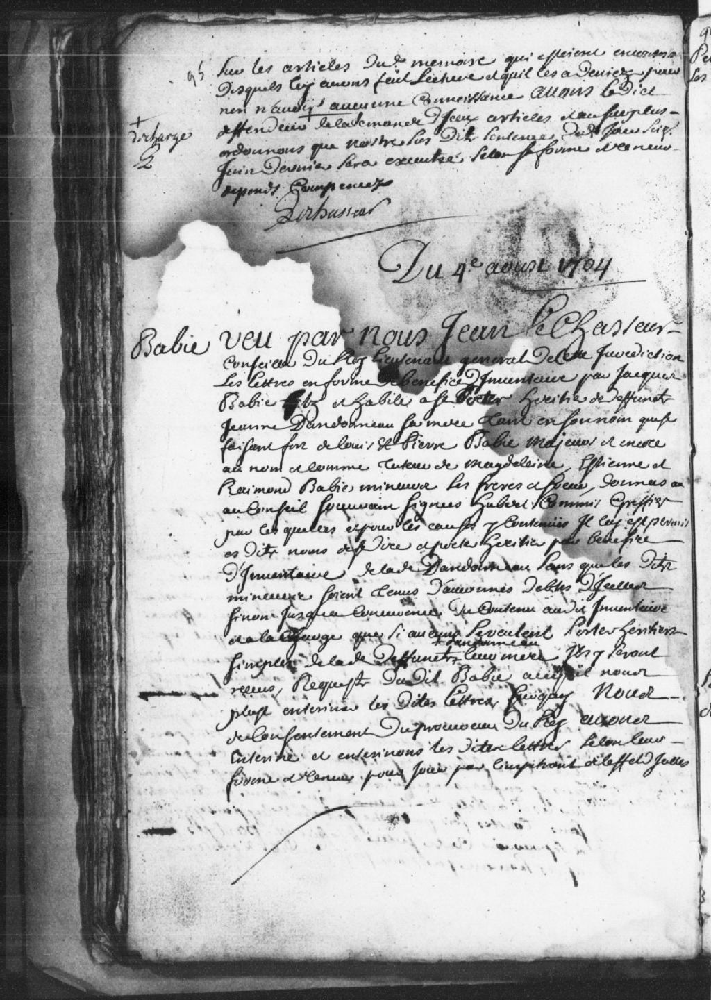 Le titre complet de la pièce se lit comme suit : Requête de Jacques Babie, fils et habile à se porter héritier de feue Jeanne Dandonneau, sa mère, tant en son nom qu'en celui de ses frères majeurs Louis et Pierre Babie, et comme tuteur de Madeleine, Étienne et Raymond Babie, ses frères et soeurs mineurs, pour faire entériner des lettres en forme de bénéfice d¿inventaire données au Conseil souverain signées Hubert, commis greffier, comme quoi Jacques Babie se porte héritier par bénéfice d¿inventaire de ladite Dandonneau sans que les mineurs soient tenus d¿aucune dette de celles-ci, et que si aucun veut se porter héritier simple de la défunte, leur mère, ils y seront reçus; les lettres sont donc entérinées avec le consentement du procureur du Roi.