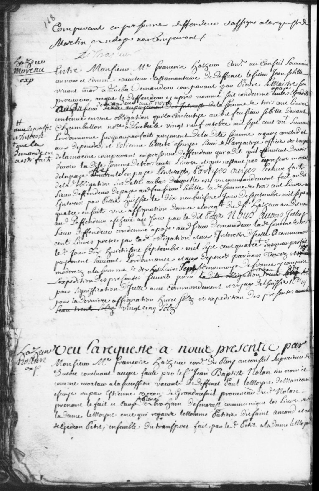 - Requête de maître François Hazeur, contre Jean-Baptiste Nolan, au nom et comme curateur à la succession vacante de feu Paul LeMoyne (Lemoine) de Maricourt, et Étienne Veron de Grandmesnil (Grandménil)...