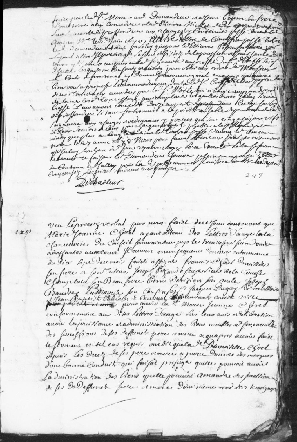 - Soussigné Lechasseur. Ont été assignés François Chorel Dorvilliers, son frère et tuteur, Joseph Pezard (Pésard), écuyer et sieur de la Touche (LaTouche) Champlain, son beau-frère, Pierre Deroziers (Desrosiers), son oncle, Joseph Baudry (Beaudry) LaMarche (Lamarche), son cousin, Jacques Dugay (Duguay), Pierre Le Maistre (Lemaître) et Jean-Baptiste Poulain de Courval. On fait mention de Pierre Lafond Mongrain comme curateur. On mentionne également l¿extrait de baptême de ladite Chorel daté du 9 septembre 1688