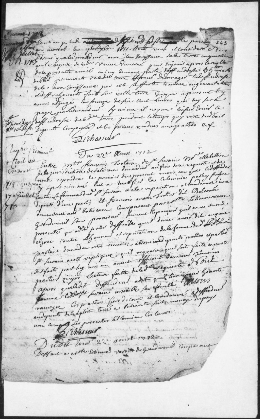 Requête de maître François Trotain de Saint-Surain, notaire et tabellion de la Juridiction de Batiscan, demandeur, contre François-Marie Trotier dit Belcourte, défendeur, comparant par maître Étienne Veron Grandmesnil, son procureur..., 22 août 1712, Archives nationales à Trois-Rivières, Fonds Juridiction royale des Trois-Rivières, (04T,TL3,S11,P2917).