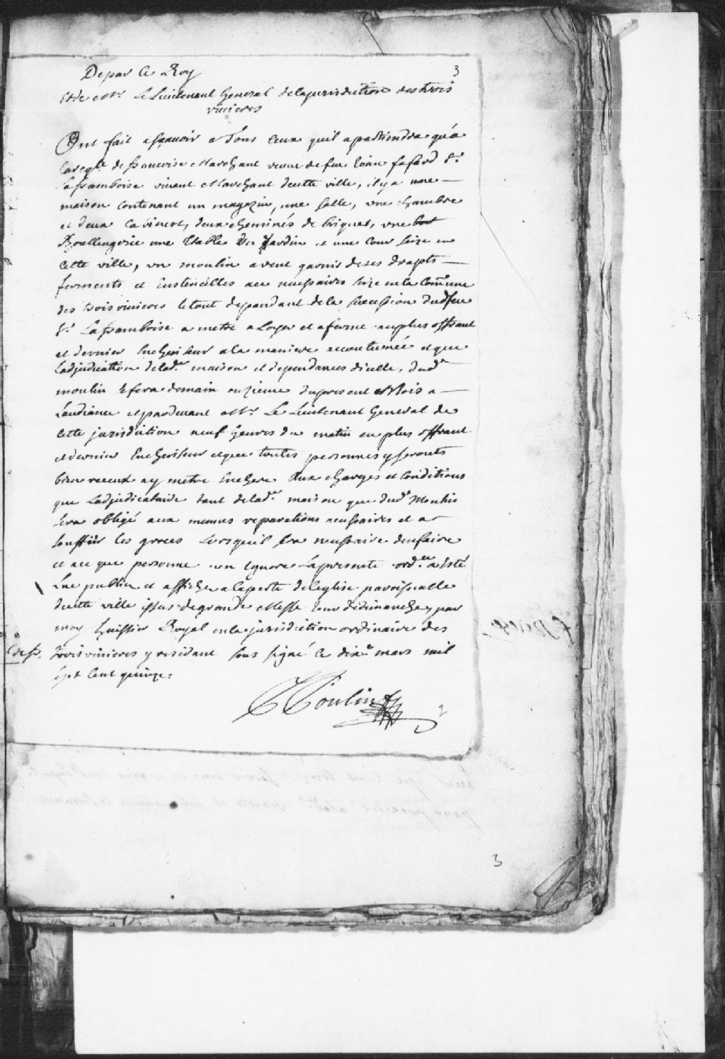 Le titre complet de la pièce se lit comme suit : Déclaration du sieur Poulin, huissier, à la requête de Françoise Marchant (Marchand), veuve de feu Jean Fafard dit Laframbroise, concernant une maison contenant une salle, une chambre, deux cabinets, deux cheminées de brique, une boulangerie, une étable, un jardin, et une cour, située à Trois-Rivières, et également un moulin à vent garni de ses draps, ferment et ustensiles, situé à la commune de Trois-Rivières, le tout dépendant de la succession dudit feu Laframboise, à mettre à loyer et à ferme au plus offrant et dernier enchérisseur, et ce, dès demain, aux clauses et conditions du bail. La présente ordonnance a été lue, publiée, et affichée à la porte de l¿église paroissiale de ladite ville par l¿huissier royal de la Juridiction de Trois-Rivières.