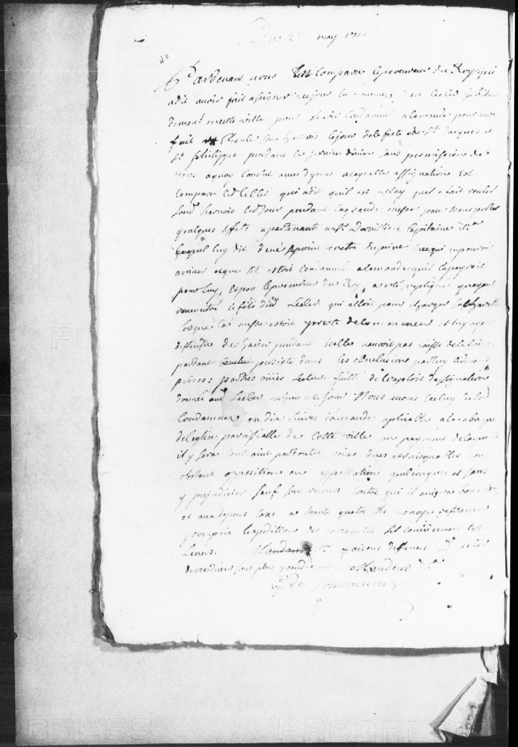 Comparution de Jean Leclerc, défendeur, d’une part, assigné à la requête du procureur du Roi, pour se voir condamné à l’amende pour avoir fait rouler son harnais le jour de la fête de Saint-Jacques et de Saint-Philippe pendant le service divin..., 2 mai 1716, Archives nationales à Trois-Rivières, Fonds Juridiction royale des Trois-Rivières, (04T,TL3,S11,P3048).