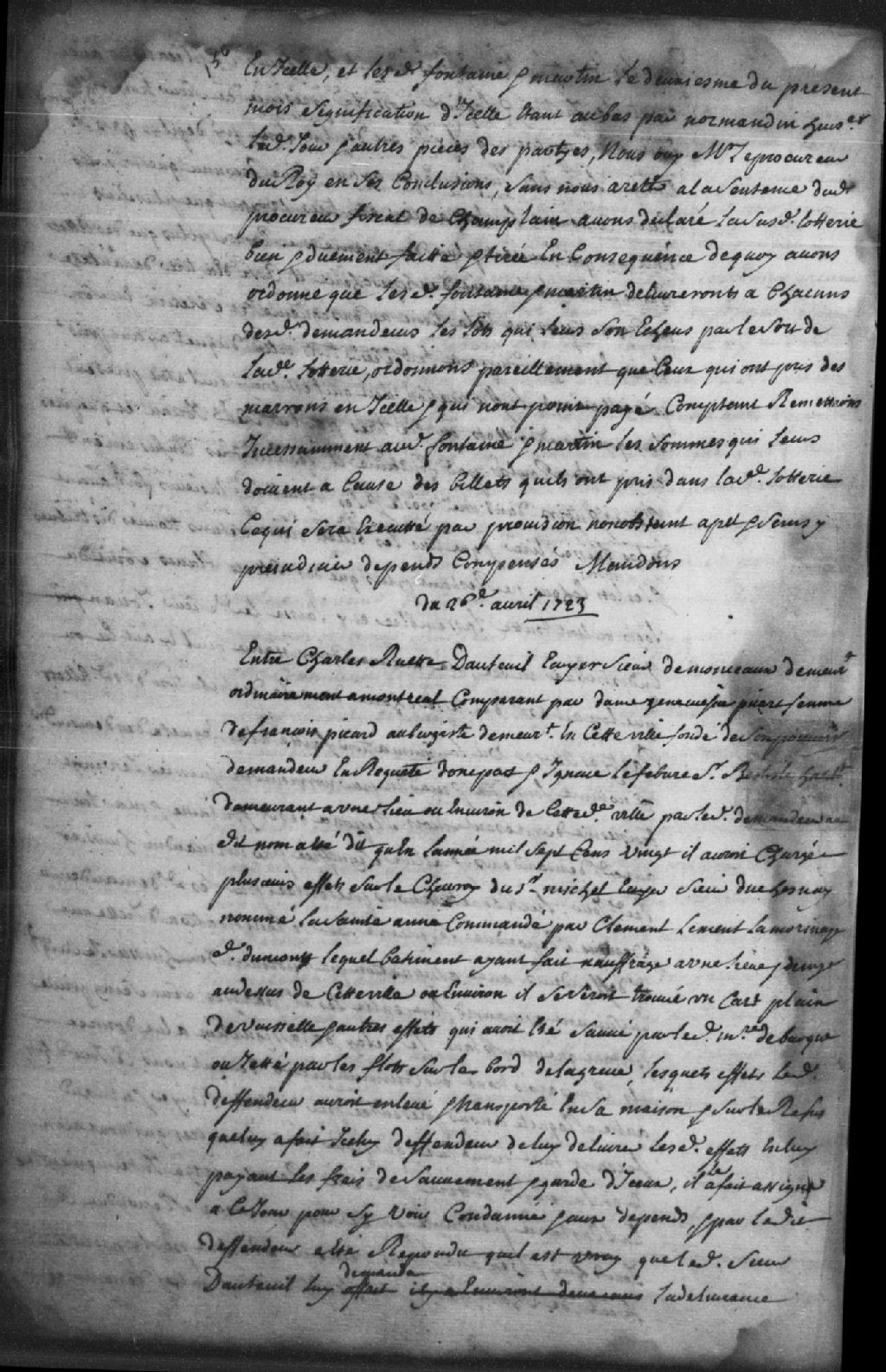 - Le titre complet de la pièce se lit comme suit : Requête Charles Ruette Dauteuil (D'Auteuil), écuyer, sieur Demonceaux (de Monceaux), demeurant ordinairement à Montréal, comparant par Geneviève Picart (Picard), femme de François Picard, aubergiste demeurant aux Trois-Rivières, demandeur, d¿une part, contre Ignace Lefebvre dit Belisle, habitant demeurant à une lieue environ de Trois-Rivières, défendeur, d¿autre part. Le demandeur a dit qu¿en 1720, il a chargé plusieurs effets sur l'embarcation nommée la «Sainte-Anne», qui appartient au sieur Michel, écuyer, sieur Duchesnay, et commandée par Clément Lement Lamorinaye (Lamorinet) dit Dumont, lequel bâtiment a fait naufrage à une lieue et demie au-dessus de Trois-Rivières, ledit défendeur, maître de barque, récupérant une caisse pleine de vaisselle et autres effets qu¿il a sauvés du naufrage ou récupérés sur la grève et qu¿il a transportés jusque chez lui, tout en faisant refus au demandeur de lui rendre lesdits effets. La Cour condamne ledit défendeur à remettre au demandeur les effets qu¿il a sauvés du naufrage et elle condamne le demandeur à lui verser 15 livres pour la récupération et l¿entreposage desdits effets et 14 francs au greffier pour les frais de justice, dépens compensés.