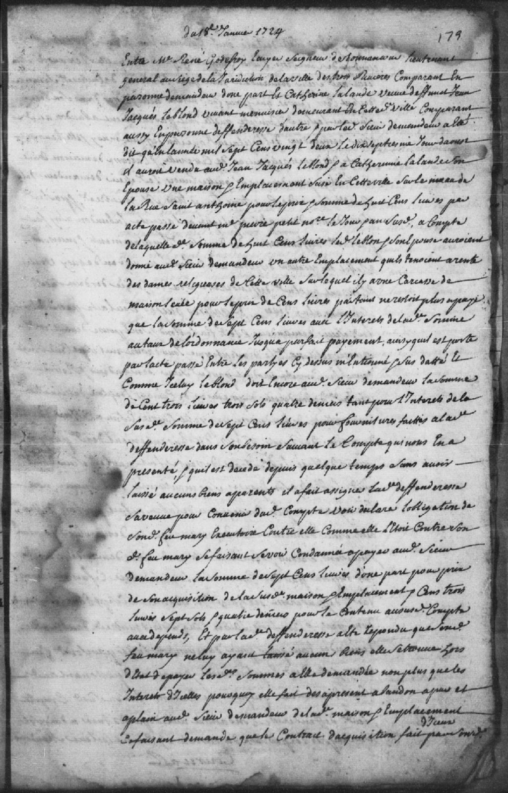 - Le titre complet de la pièce se lit comme suit : Requête de maître René Godefroy, écuyer, seigneur de Tonnancour, lieutenant-général au siège de la Juridiction de Trois-Rivières, demandeur, d¿une part, contre Catherine Lalande, veuve de feu Jean-Jacques Leblond, vivant menuisier demeurant à Trois-Rivières, défenderesse, d¿autre part. Le demandeur affirme qu'il a vendu une maison sise sur la rue Saint-Antoine à Trois-Rivières pour la somme de 800 livres par un acte passé devant maître Pierre Petit, notaire et, à titre de paiement, ledit feu Leblond et son épouse lui ont donné un autre emplacement évalué à 100 livres, sur lequel il y a une carcasse de maison, qu¿ils tenaient à rente des Dames Religieuses de Trois-Rivières, ledit Godefroy réclamant donc que la défenderesse soit tenue de payer la somme de 700 livres, d¿une part, pour l¿acquisition de la maison et de son emplacement, et celle de 103 livres, 3 sols et 4 deniers pour ce qui [...]