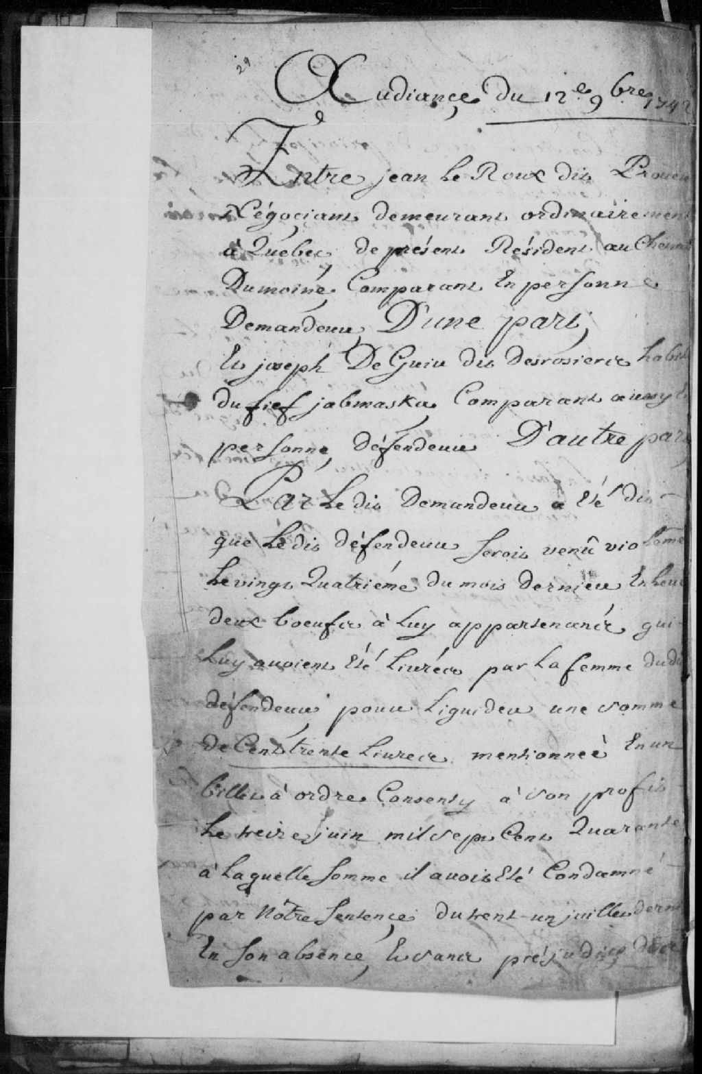 - Le titre complet de la pièce se lit comme suit : Requête de Jean le Roux (Leroux) dit Provencal (Provençal), négociant, demeurant ordinairement à Québec et présentement au chenal Dumoine (du Moine), demandeur, contre Joseph de Guire (Deguire) dit Desrosiers, habitant du fief Iabmaska (Yamaska), défendeur, pour 2 boeufs que ledit défendeur aurait enlevés violemment le 24 de ce mois, après avoir été livrés précédemment par la femme dudit de Guire afin de liquider une somme de 130 livres, somme à laquelle il avait été condamné de payer lors de la sentence du 31 juillet 1741; le défendeur est condamné à la somme de 10 livres d'amende pour voie de fait et ordonné que les pièces justificatives seront communiquées à monsieur le procureur du Roi, pour donner ses conclusions, et ce, dans 8 jours, dépens réservés, signé Courval.Sont aussi concernés le notaire Lafosse, Gilles Laplante, l'huissier Pressé, François, domestique du défendeur, et René [...]
