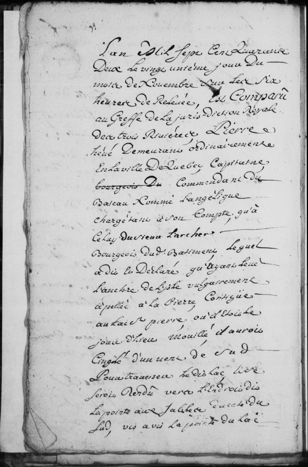 - Comparution de Pierre Hévé, capitaine et commandant du bateau «l'Angélique», chargé tant à son compte que celui du sieur Larcher, déclarant qu'il a dû lever l'ancre, sur le lac Saint-Pierre, pour ensuite se rendre à la Pointe-aux-Sables...