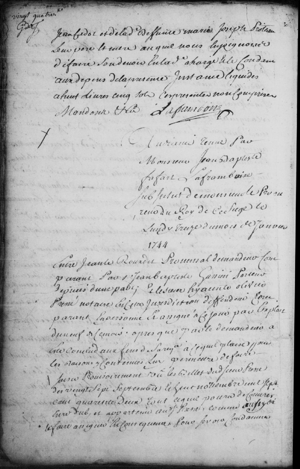 Requête entre Jean le Roux (Leroux) dit Provensal (Provençal), demandeur, comparant par Jean-Baptiste Gassien (Gatien), porteur de pièces, contre Hyacinthe Olivier Pressé, notaire, défendeur, pour saisir provisoirement les billets du défendeur en date du 27 septembre et du 8 novembre 1742 ; il est ordonné que le demandeur comparaîtra en personne pour affirmer qu'il n'a pas été payé de la somme de 40 livres, valeur des billets, dépens réservés, 13 janvier 1744, Archives nationales à Trois-Rivières, Fonds Juridiction royale des Trois-Rivières, (04T,TL3,S11,P3387).