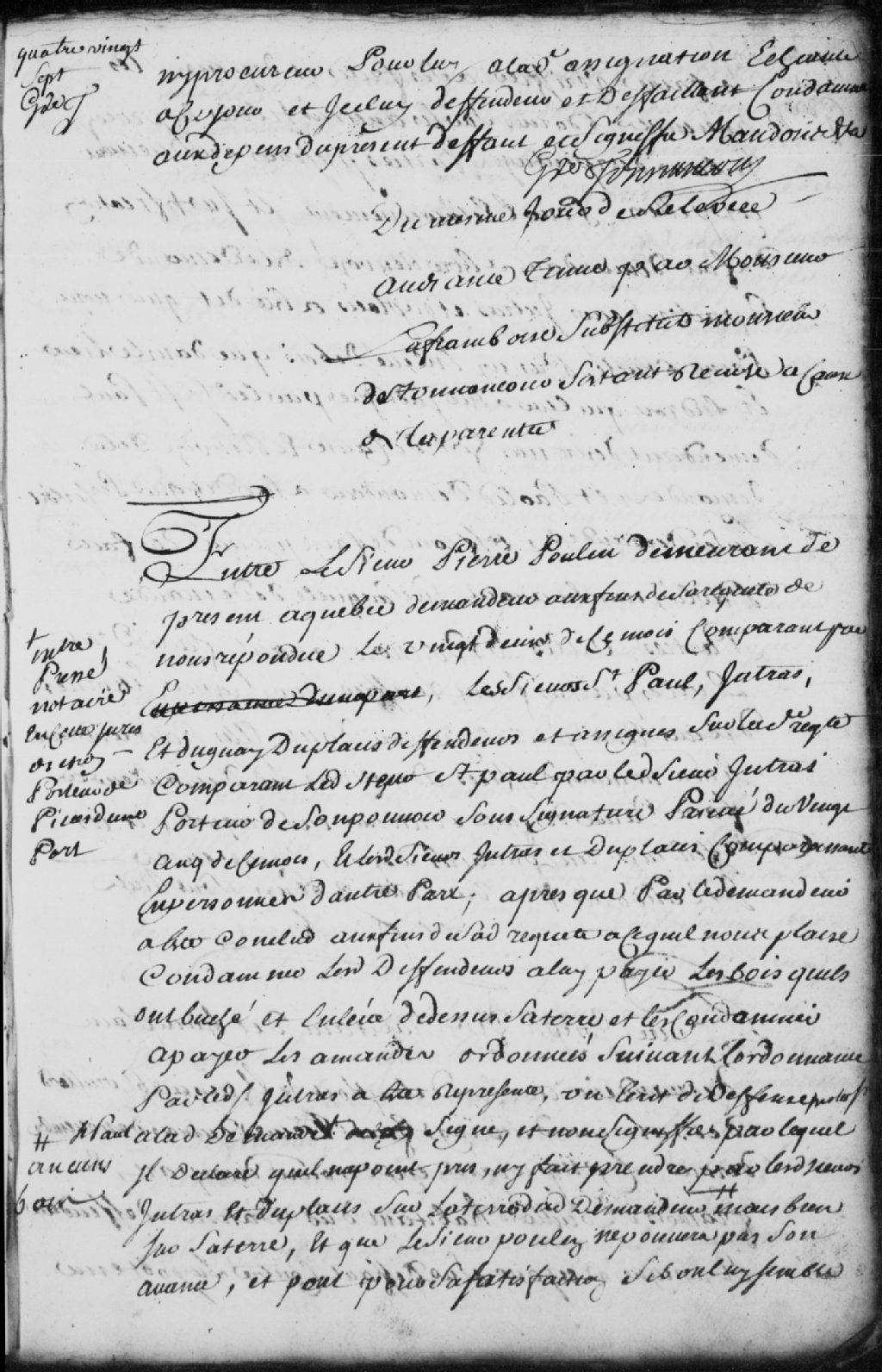 Le titre complet de la pièce se lit comme suit : Requête entre Pierre Poulin (Poulain), demeurant à Québec, demandeur, comparant par maître Pressé, notaire de la Juridiction de Trois-Rivières, porteur de pièces, contre les sieurs Saint-Paul, Jutras et Duguay Duplacis (Duplessis), défendeurs, comparant ledit Saint-Paul par ledit Jutras, pour lui payer le bois qu'ils ont buché de sur sa terre et à payer les amendes ordonnées suivant l'ordonnance ; ledit sieur Jutras dit qu'ils ont bûché sur sa terre et non pas sur celle du demandeur ; parties en désaccord ; il est ordonné que les parties fassent vérifier les lignes et bornes de leurs terres par un arpenteur dont elles conviendront, sinon nommé d'office, et il est admis audit demandeur de faire preuve des faits de sa requête et les défendeurs au contraire, dépens compensés.