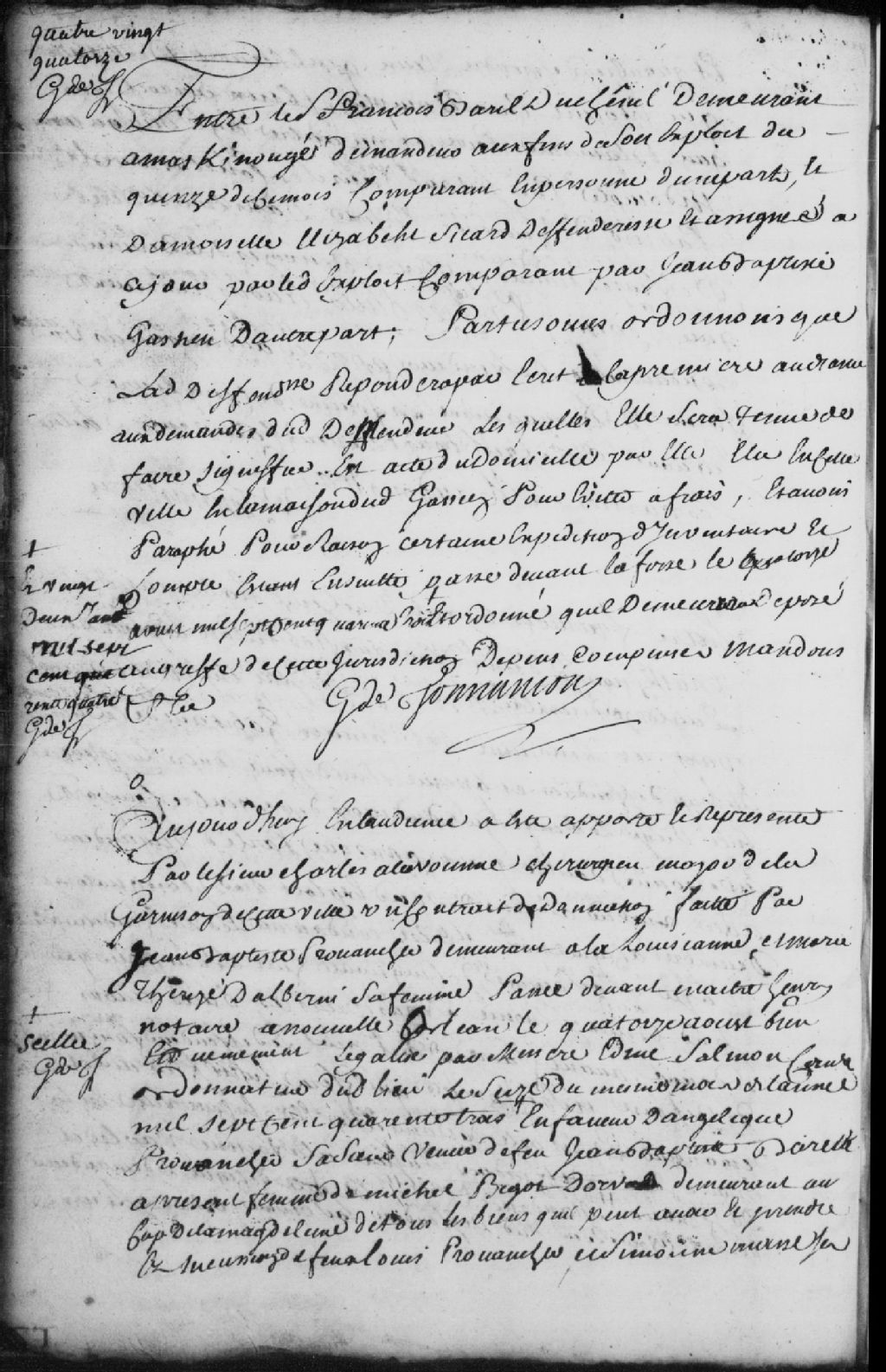 Contrat de donation entre Jean-Baptiste Provancher (Provencher), demeurant à la Louisiane, Marie-Thérèse Dalberni (Dalberny), sa femme, et Angélique Provancher, sa soeur, veuve de feu Jean-Baptiste Barette, à présent femme de Michel Bigot Dorval, demeurant au Cap-de-la-Madeleine, pour le partage des biens de feu Louis Provancher et sa femme Simone Massé ; il est ordonné que lesdites donations, légalisation et acte d'acceptation seront insinués et enregistrés au registre des insinuations, 25 janvier 1745, Archives nationales à Trois-Rivières, Fonds Juridiction royale des Trois-Rivières, (04T,TL3,S11,P3459).