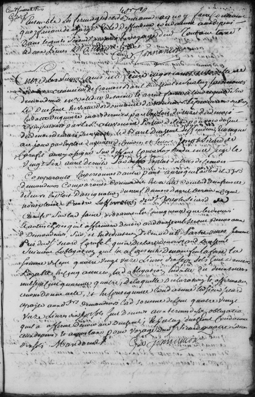 Le titre complet de la pièce se lit comme suit : Requête entre les sieurs Havis (Havy) et Lefèvre (Lefebvre), négociants en la ville de Québec, créanciers de François Baril Duchenil (Duchesny, Ducheny), marchand à Maskinongé, demandeurs en validité de saisie et arrêt faits sur ledit Duchenil, comparant par le sieur Alavoinne (Alavoine), contre François Baril Duchenil, défendeur, et Joseph Sicard de Carufel, assigné, pour que ledit Sicard remette les deniers et autres choses qu'il affirmera devoir audits demandeurs, soit la somme de 196 livres, 17 sols et 8 deniers payable en cinq années ; ledit Sicard est condamné à payer aux demandeurs la somme de 196 livres, 17 sols et 8 deniers aux termes de son obligation et ledit Duchenil est condamné aux dépens taxés à 4 livres et 10 sols.