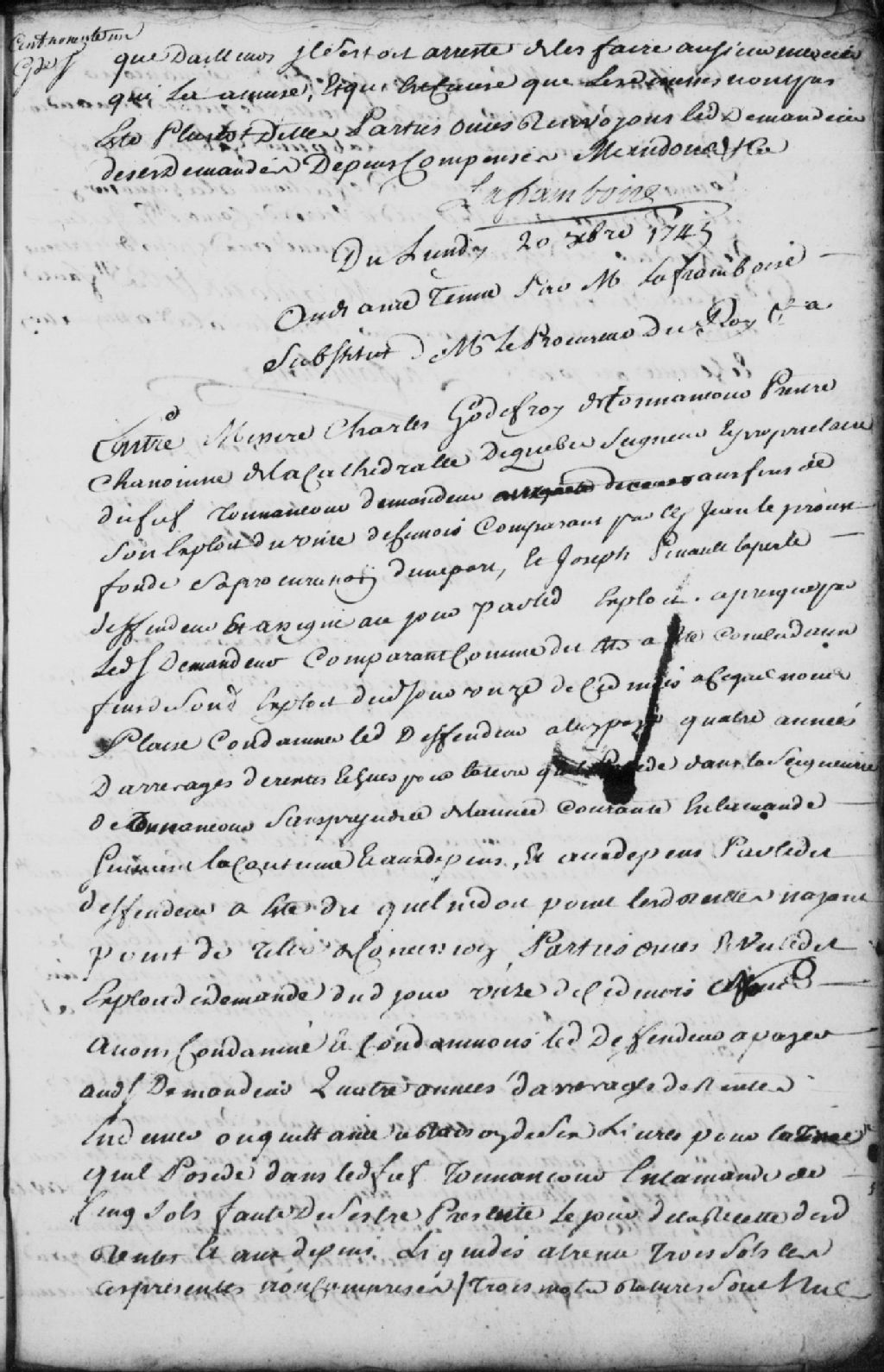 Requête entre messire Charles Godefroy de Tonnancour, prêtre chanoine de la cathédrale de Québec, seigneur et propriétaire du fief Tonnancour, demandeur, contre Joseph Pinault (Pineau, Pinot) Laperle, défendeur..., 20 décembre 1745, Archives nationales à Trois-Rivières, Fonds Juridiction royale des Trois-Rivières, (04T,TL3,S11,P3577).
