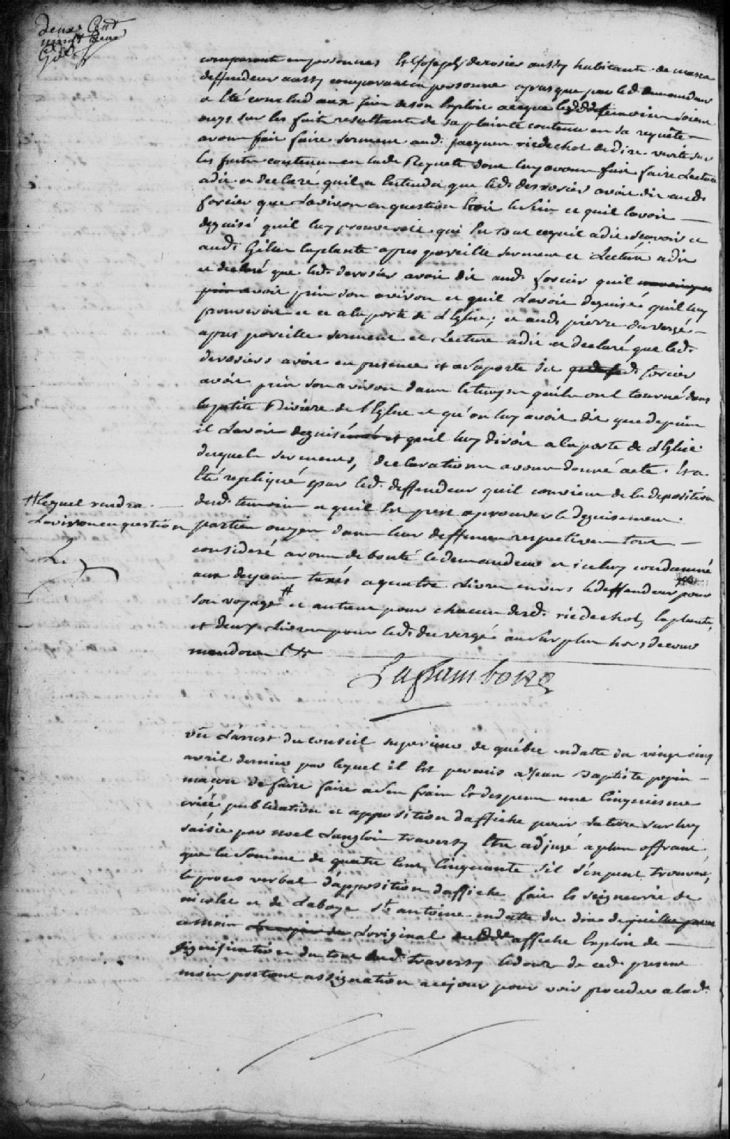 - Le titre complet de la pièce se lit comme suit : Arrêt du Conseil supérieur de Québec, pour permettre à Jean-Baptiste Pépin, maçon, de faire faire une cinquième criée, publication et apposition d'affiches pour la terre sur lui saisie par Noël Langlois Traversy, pour être adjugée au plus offrant de la somme de 450 livres ; il est ordonné et déclaré qu'il sera présentement et sans aucune remise procédé à l'adjudication de ladite terre ; ladite terre adjugés à Claude Poulin Cressé pour la somme de 651 livres qu'il sera tenu de consigner suivant l'ordonnance pour être distribuée suivant l'arrêt qui interviendra sur la sentence rapportée au Conseil supérieur, payer les droits du lot au seigneur et ensemble les frais faits pour parvenir à ladite vente dont la taxe est à faire, ce faisant le sieur Cressé est mis en possession réelle et actuelle de ladite terre.