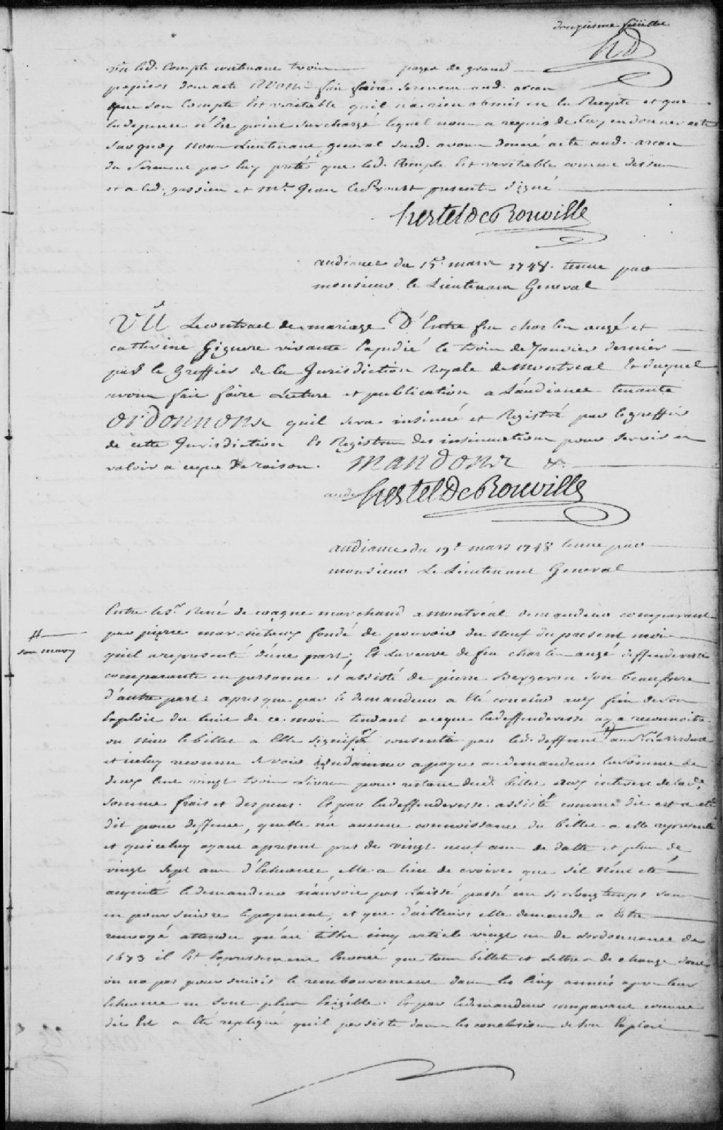 Lecture et publication du contrat de mariage de feu Charles Augé (Auger) et Catherine Giguère, encore vivante, expédié le 3 janvier 1748, par le greffier de la juridiction royal de Montréal; il est ordonné qu’il sera insinué et registré par le greffier de la Juridiction des Trois-Rivières dans le registre des insinuations pour servir et valoir en justice