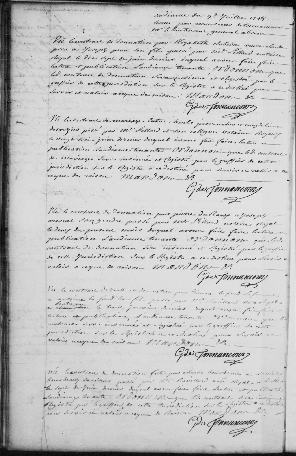 Lecture et publication du contrat de donation fait par Charles Bourbeau à Louise Bourbeau, passé par maître Rouillard, notaire royal à Batiscan, le 7 juin 1748; il est ordonné qu’il soit insinué et registré par le greffier de la Juridiction des Trois-Rivières sur le registre des insinuations pour servir et valoir en justice