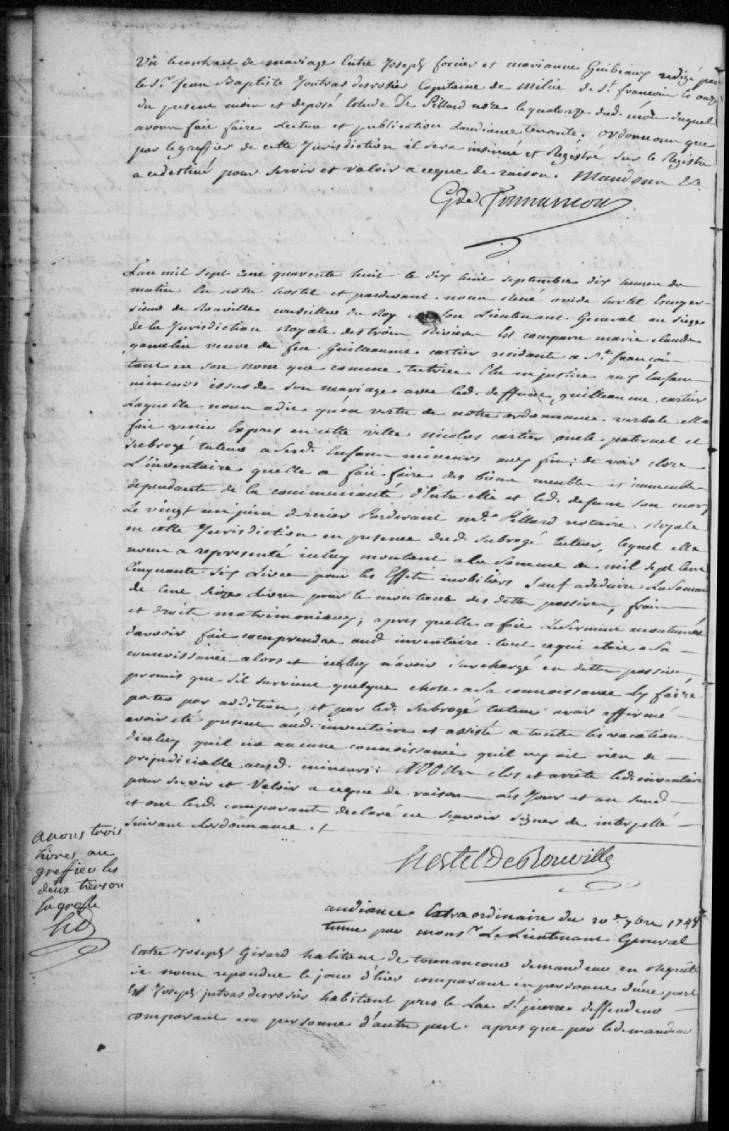 - Le titre complet de la pièce se lit comme suit : Requête de Joseph Girard, habitant de Tonnancour, demandeur, contre Joseph Jutras Desrosiers, habitant près du lac Saint-Pierre, défendeur, pour que ce dernier soit condamné à payer l¿amende pour avoir tué le chien du demandeur; le défendeur répond qu¿il est vrai qu¿il l¿a tué d¿un coup de fusil et qu¿il s¿est permis de le faire puisqu¿il avait la réputation d¿être mauvais envers les gens et qu¿il avait déjà mordu le neveu du demandeur; ce dernier répliquant que le chien avait mordu le jeune homme puisque lui et d¿autres jeunes de son âge lui avait ôté une chienne chaude et lui avait donné des coups de bâtons et qu¿il n¿avait jamais fait de mal à personne; le défendeur est renvoyé de l¿action en affirmant que le chien avait couru vers lui et parce que l¿animal avait déjà mordu quelqu¿un; dépens compensés.