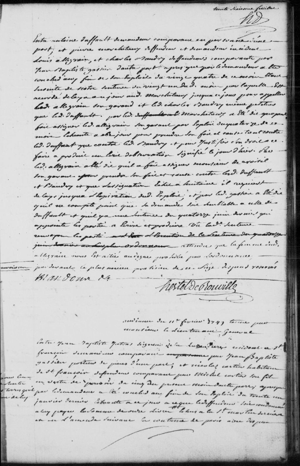 Le titre complet de la pièce se lit comme suit : Requête d¿Antoine Duffault (Dufault), demandeur, contre Pierre Marchetaux (Marcheteau), et Louis Allegrain (Algrin), demandeur incident, contre Charles Baudry (Beaudry), défendeur, comparant par Jean-Baptiste Gassien (Gatien), pour la poursuite de la sentence du 21 janvier qui accordait un délai jusqu¿à ce jour audit Marchetaux pour appeler son garant et Charles Baudry même pétiteur que Duffault; ledit Marchetaux a fait assigner Allegrain qui à son tour a fait assigner monsieur de Croisil (Croizille), son garant, pour se défendre contre lesdits Duffault et Baudry et requiert délai; Gassien dit qu¿il y a une sentence du 14 juin 1748 qui appointe les parties à écrire et produire; les parties sont renvoyées puisque la femme d¿Allegrain est alliée à la Cour au degré prohibé par l¿ordonnance par-devant le plus ancien praticien du siège des Trois-Rivières; dépens réservés.