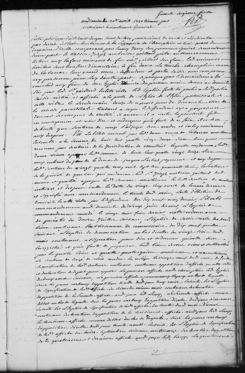 - Le titre complet de la pièce se lit comme suit : Défaut à Philippe d¿Ailleboust (Dailleboust), écuyer, sieur de Cery (Cerry), poursuivant la vente et l¿adjudication par décret des trois huitièmes de la seigneurie de Champlain et des trois quarts du domaine de la seigneurie, demandeur, comparant par Emery Jarry, son procureur spécial, contre messire Joseph Ambroise Gaillard, prêtre et tuteur des enfants mineurs de feu monsieur Gaillard, son frère, qui sont héritiers sous bénéfice d¿inventaire de feue la dame Latouche Champlain, veuve de Cabanac et leur grand-mère, défendeur, défaillant et partie saisie, pour que le défendeur ait à proposer et donner ses moyens de nullité et sinon qu¿il en soit débouté et qu¿une sentence de congé d¿adjugé soit rendue; le défendeur est débouté, les pièces de commandement recordées, de saisie réelle, de dénonciation de saisie-réelle et des quatre criées, de certification de celles-ci, et de la sentence de rapport sont déclarées bien et dûment faites et signifiées; il est ordonné que le décret demeure interposé à la quarantaine, que les biens saisis soient vendus par décret et autorité de justice en la chambre d¿audience du siège des Trois-Rivières, au plus offrant et dernier enchérisseur, que des affiches à la quarantaine avec panonceaux royaux aux armes de France seront mises et apposées sans que la partie saisie soit convoquée ni appelée.