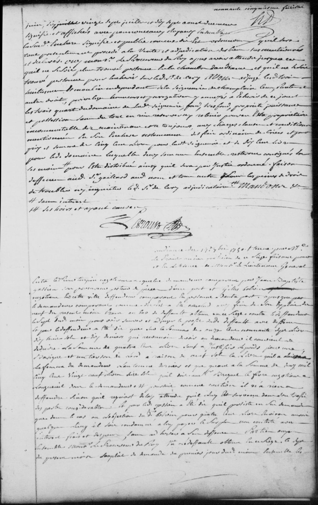 - Le titre complet de la pièce se lit comme suit : Requête du sieur Turpin, négociant à Québec, demandeur, comparant par Jean-Baptiste Gassien (Gatien), son procureur et porteur des pièces, contre Gilles Bolvin, négociant à Trois-Rivières, défendeur, pour sauver et adjuger le profit du défaut du 7 septembre; le défendeur répond que sur la somme de 1197 livres, 18 sols et 10 deniers qu¿il doit au demandeur, il doit être déduit le montant de 400 livres, à condition de justifier le poids pour une barrique et un tiers de son lard à 9 sols la livre, qu¿il a laissée à la femme du demandeur l¿automne dernier, et qu¿il doit la somme de 2529 livres et 16 sols au sieur Brequet (Briquet) Lefevre (Lefebvre), négociant à Longueuil, il requiert délai puisqu¿il est survenu des pertes considérables dans son trafic; le défendeur est condamné à payer au demandeur la somme de 2529 livres et 16 sols, aux intérêts de la somme depuis le 4 septembre 1749, et à la somme de 1197 livres, 18 sols et 10 deniers en déduisant la somme de 400 livres, aux intérêts de la somme et aux dépens liquidés à 6 livres et 16 sols.