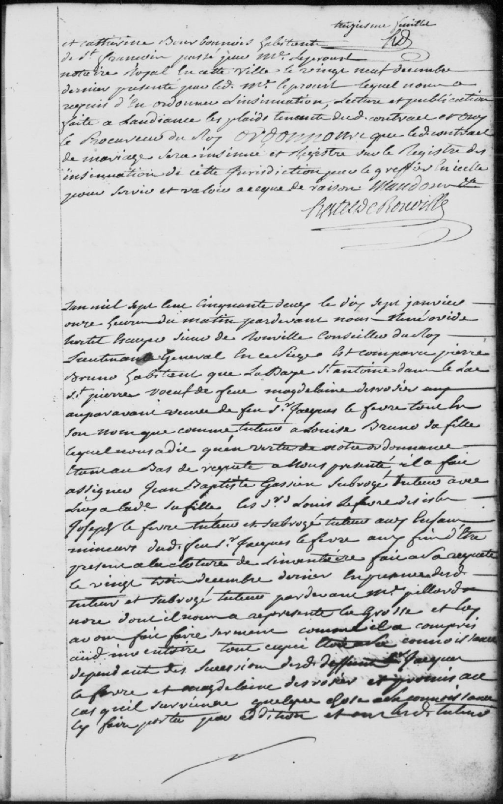 - Comparution de Pierre Bruno (Bruneau), habitant de la Baie-Saint-Antoine-du-Lac-Saint-Pierre, veuf de feue Madeleine Desrosier (Desrosiers), auparavant veuve de feu sieur Jacques Lefevre (Lefebvre), tant en son nom que comme tuteur de Louise Bruno...