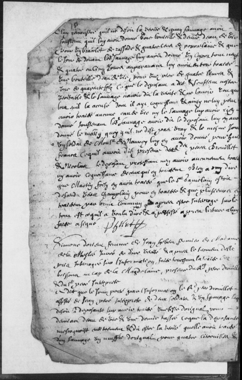 Contre témoignage à l'égard de Jean Hébert affirmant que ce dernier avait traité de l'eau-de-vie (alcool) avec un sauvage (Amérindien) pour un bracelet de rassade, 4 cens de porcelaine, un capot tout neuf, une pièce de 4 livres et une pièce de 40 sols. Ledit Hébert a affirmé ne jamais avoir traité avec le sauvage qui a fait cette dernière déclaration et que parmi ceux qui font le commerce d'eau-de-vie avec les sauvages se trouvent Martin Foisy et le sieur Gamelin