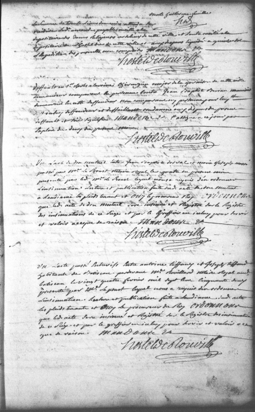 Lecture et publication d’un acte de donation entre Jean-Baptiste Dorval et Marie-Josèphe Massé par maître LeProust (Leprou, Prou, Proulx), notaire royal, le 4 juin 1756 et présenté par LeProust; il est ordonné qu’il sera insinué et registré sur les registres des insinuations du siège des Trois-Rivières par le greffier pour servir et valoir en justice