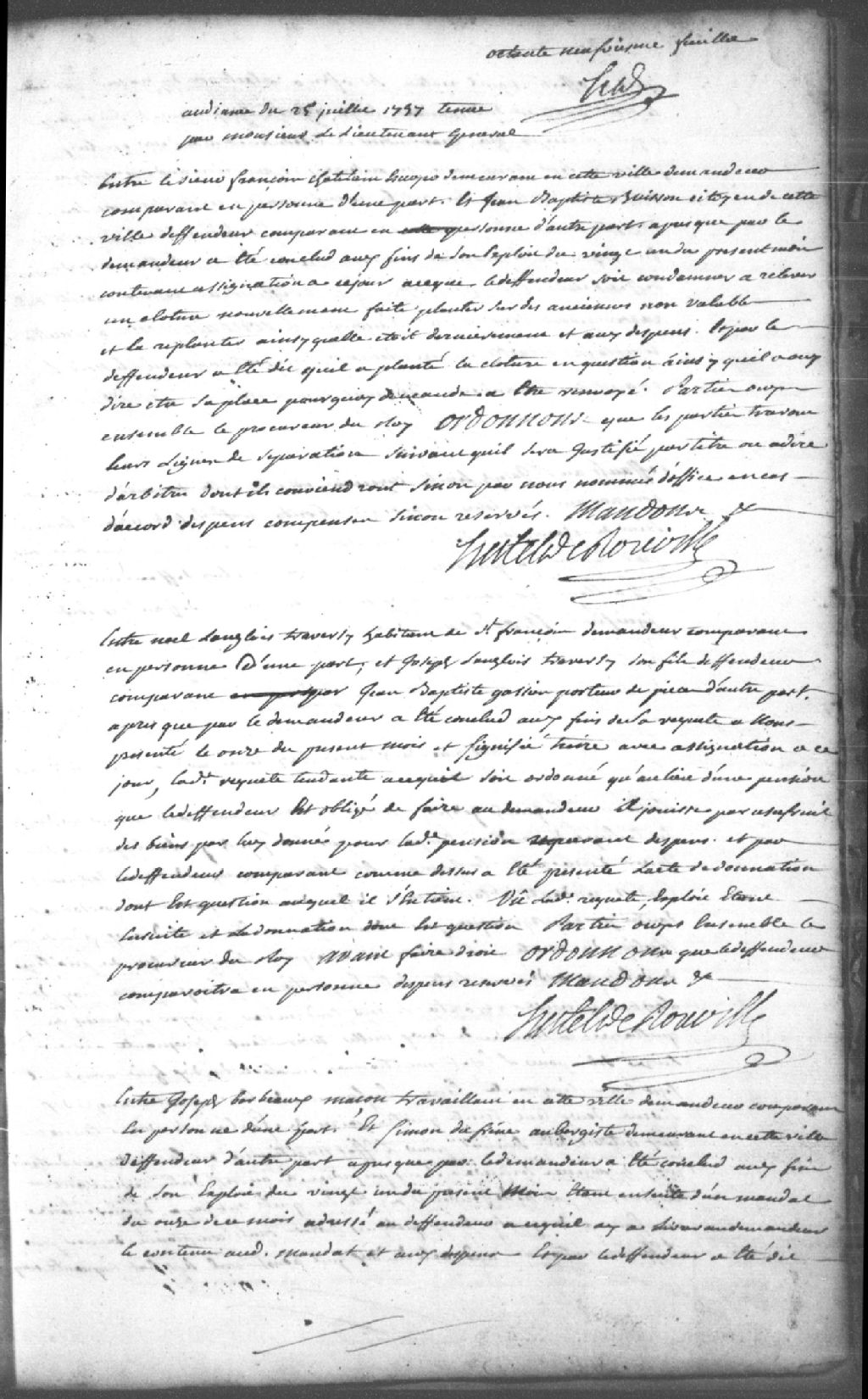 Requête de Noël Langlois Traversy, habitant de Saint-François, demandeur, contre Joseph Langlois Traversy, son fils, défendeur comparant par Jean-Baptiste Gassien (Gatien), porteur de pièces, pour que le demandeur jouisse par usufruit au lieu d’une pension du défendeur; le défendeur répond qu’il s’en tient à l’acte de donation; la Cour ordonne que le défendeur comparaisse en personne; dépens réservés