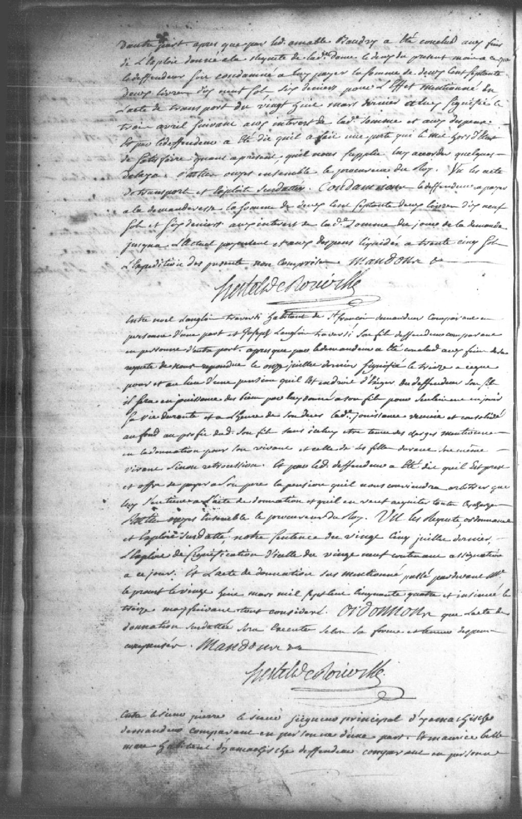 Le titre complet de la pièce se lit comme suit : Requête de Noël Langlois Traversi (Traversy), habitant de Saint-François, demandeur, contre Joseph Langlois Traversi (Traversy), son fils, défendeur, pour faire suite à la sentence du 25 juillet 1757 afin que la pension à laquelle le défendeur est obligé de payer au demandeur soit plutôt la jouissance du profit provenant des biens que le demandeur lui a donné selon l¿acte de donation passé par-devant maître Leproust le 28 mars 1754; le défendeur répond qu¿il s¿en tient à l¿acte de donation; la Cour ordonne que ledit acte de donation sera exécuté selon sa forme et teneur; dépens compensés.