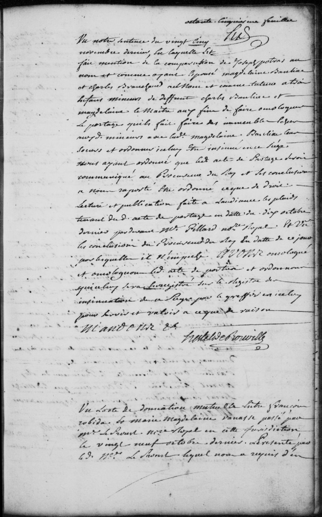 Homologation d’un acte de partage entre Joseph Potras (Poitras), en tant qu’époux de Madeleine Banliac, et Charles Branchaud, en tant que tuteur à 3 enfants mineurs de défunt Charles Banliac et Madeleine LeMaître, en suite de la sentence du 25 novembre 1753; lecture et publication faite le 6 octobre 1753 par-devant maître Pillard, notaire royal; la Cour ordonne que le contrat enregistré sur le registre des insinuations siège de Trois-Rivières par le greffier pour servir et valoir en justice