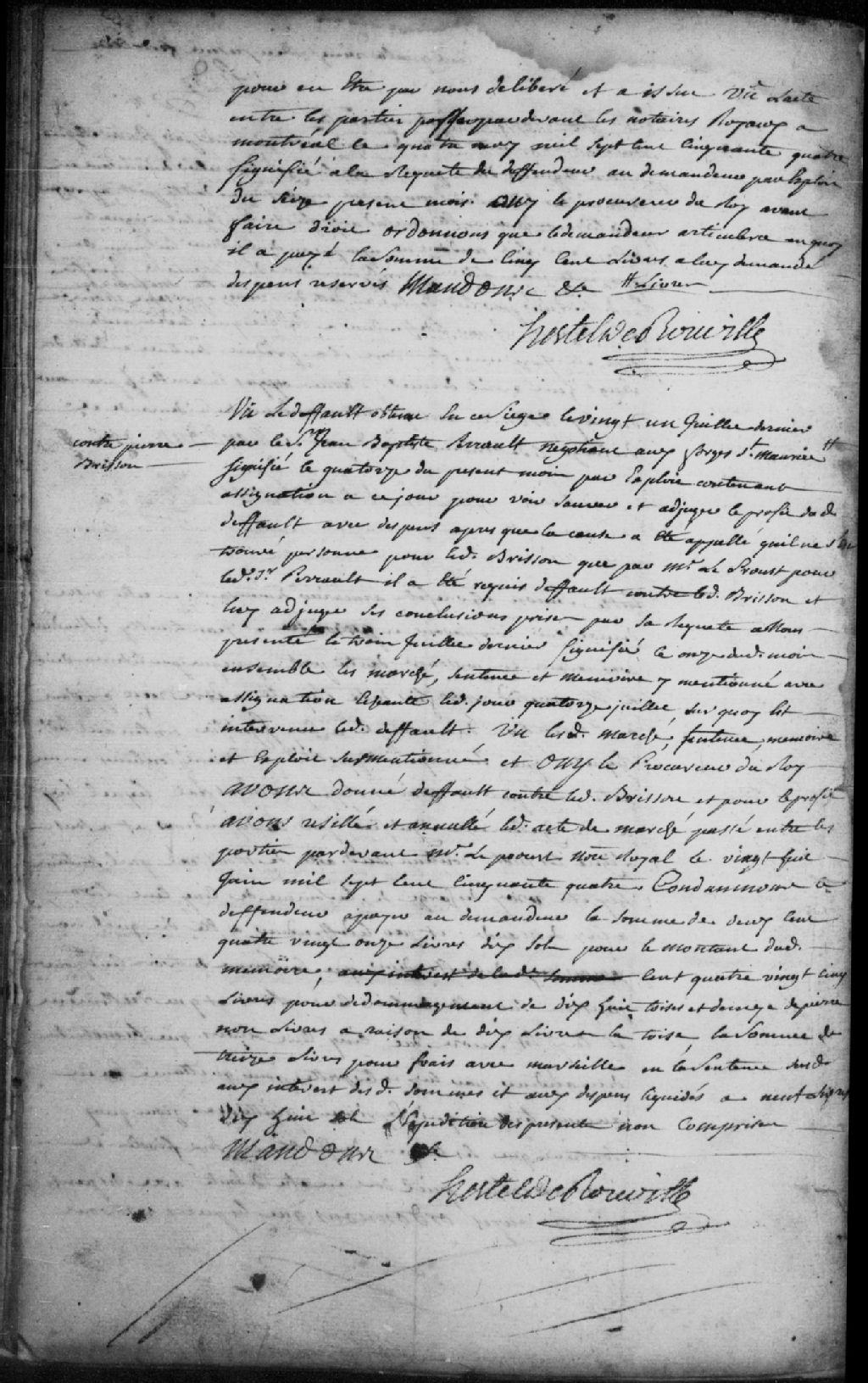 Le titre complet de la pièce se lit comme suit : Défaut accordé au sieur Jean-Baptiste Perrault, négociant aux Forges-du-Saint-Maurice et comparant par LeProust, contre Pierre Brisson, pour faire suite et obtenir profit du défaut daté du 21 juillet 1755 concernant un marché, une sentence et un mémoire; la Cour résille et annule l¿acte de marché passé entre les parties par-devant maître Leproust, notaire royal, le 28 juin 1754; le défendeur est condamné à payer au demandeur la somme de 291 livres et 10 sols pour le montant dudit mémoire, celle de 185 livres pour dédommagement de 18 toises et demie de pierre non livrées au prix de 10 livres la toise, celle de 13 livres pour les frais avec Marseille en ladite sentence, aux intérêts desdites sommes et aux dépens liquidés à 9 livres et 18 sols.