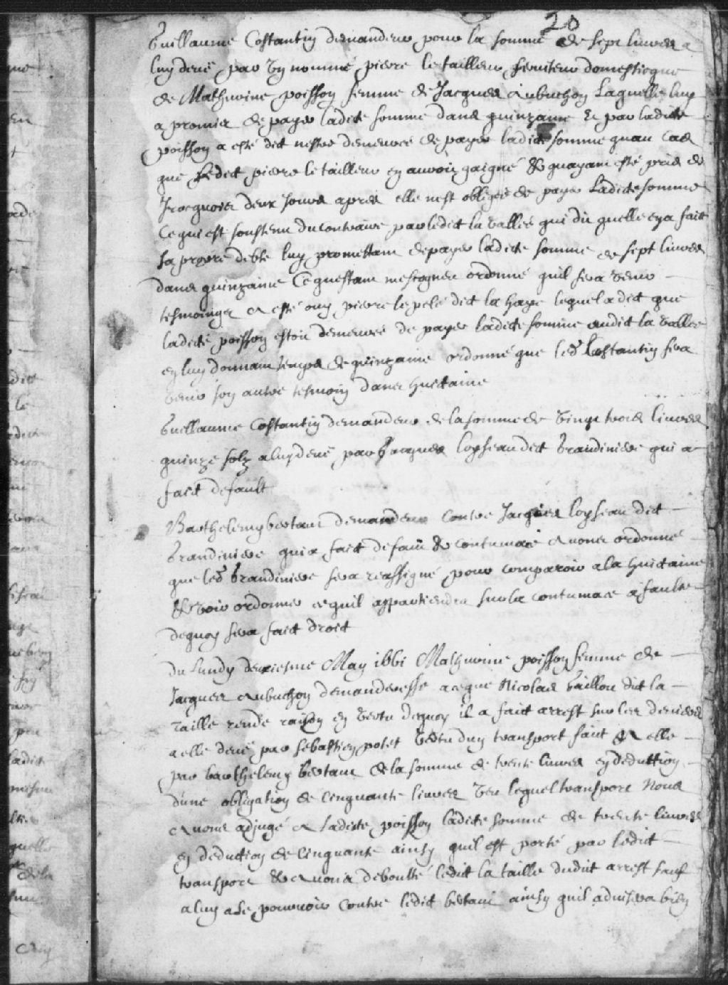 Requête de Mathurine Poisson, femme de Jacques Aubuchon, demanderesse, contre Nicolas Gaillou (Gaillon) dit la Taille (Lataille), pour qu'il rende raison en vertu de quoi il a fait arrêt sur les deniers à elle dus par Sébastien Polet (Pollet) en vertu d'un transport fait à elle par Barthélémy Bertaut (Bertault) de la somme de 30 livres; adjugé à ladite Poisson ladite somme de 30 livres en déduction de 50 livres et débouté ledit la Taille dudit arrêt sauf à lui à se pourvoir contre ledit Bertaut