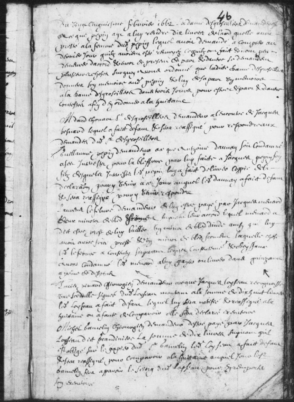 Instance de la dame des Groseillers (Desgroseillers), demanderesse à ce que Pépin lui rende les 10 livres de lard qu'elle lui avait prêté; avaient été renvoyés pour compter, mais ne peuvent encore s'entendre; demande de produire leurs mémoires dans 3 jours; reviendront à la huitaine