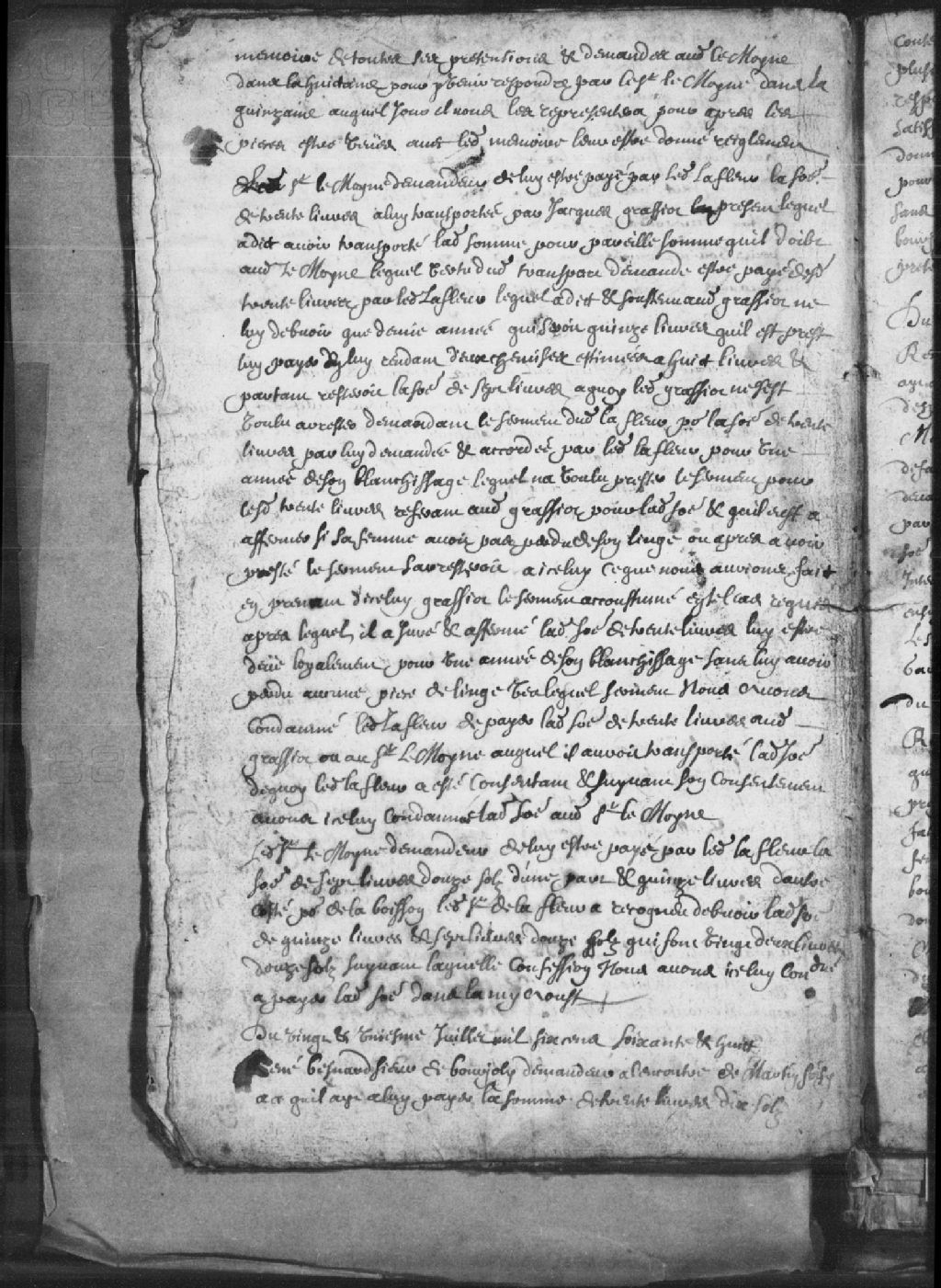Le titre complet de la pièce se lit comme suit : Requête du sieur Lemoine (Lemoyne), demandeur, de lui être payée par ledit Lafleur la somme de 30 livres à lui transportée par Jacques Gratiot (Grassiot, Graciot), présent, lequel a dit avoir transporté ladite somme pour pareille somme qu'il doit audit Lemoine (Lemoyne) qui, lui, demande le paiement de la somme de 30 livres par ledit Lafleur lequel a dit et soutenu audit Gratiot (Grassiot, Graciot) ne lui en devoir qu'une demi-année, soit 15 livres, qu'il est prêt à lui payer. Lafleur est condamné à payer ladite somme de 30 livres audit Gratiot (Grassiot, Graciot) ou au sieur demandeur.
