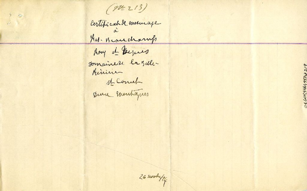 Certificat de mesurage, à la requête de François Beauchamp, cultivateur de la paroisse de Saint-Canut, de son terrain situé au rang Saint-Jacques dans le domaine de la Belle-Rivière dans la dite paroisse et portant les n° 232, 233 et 234, 26 novembre 1894, Archives nationales à Montréal, Fonds Cour supérieure. District judiciaire de Montréal. Greffes d'arpenteurs, (06M,CA601,S40,SS2,D219).