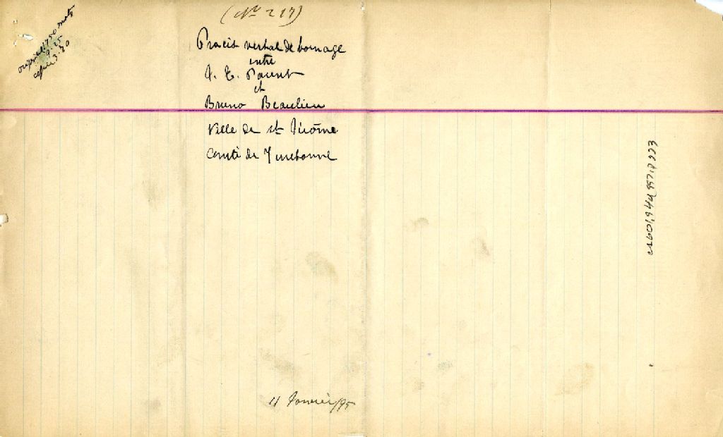 - Procès-verbal de bornage et croquis, à la requête conjointe de J.E. Parent, notaire, et Bruno Beaulieu, commerçant, tous deux de la ville de Saint-Jérôme, pour établir la ligne de division de leurs terrains situés dans la dite ville
