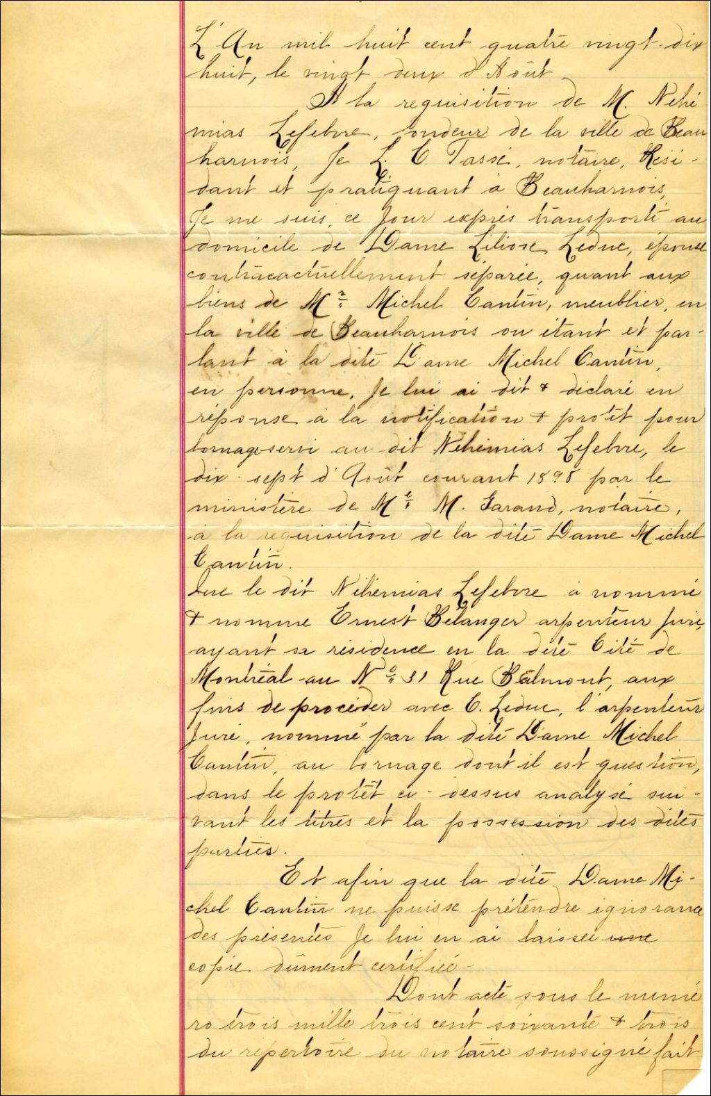 Réponse à protêt à Marie Loïse Éliose Leduc, épouse séparée de biens de Michel Cantin, par Néhémias Lefebvre, fondeur, tous deux de la ville de Beauharnois, pour établir la ligne de division entre leurs propriétés portant les n° 226 et 225 de la ville de Beauharnois, 22 août 1898, Archives nationales à Montréal, Fonds Cour supérieure. District judiciaire de Montréal. Greffes d'arpenteurs, (06M,CA601,S41,SS1,D10).
