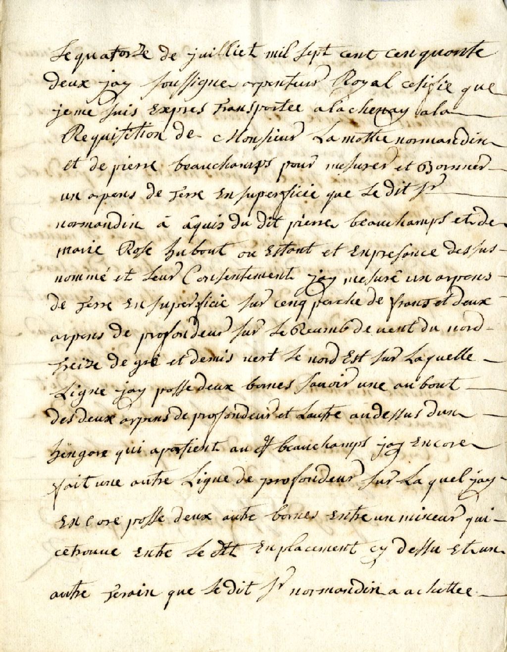 Procès-verbal de mesurage et de bornage, à la requête de Lamothe Normandin et Pierre Beauchamps, d'un emplacement situé à Lachenaie, 14 juillet 1752, Archives nationales à Montréal, Fonds Cour supérieure. District judiciaire de Montréal. Greffes d'arpenteurs, (06M,CA601,S42,SS1,D5).