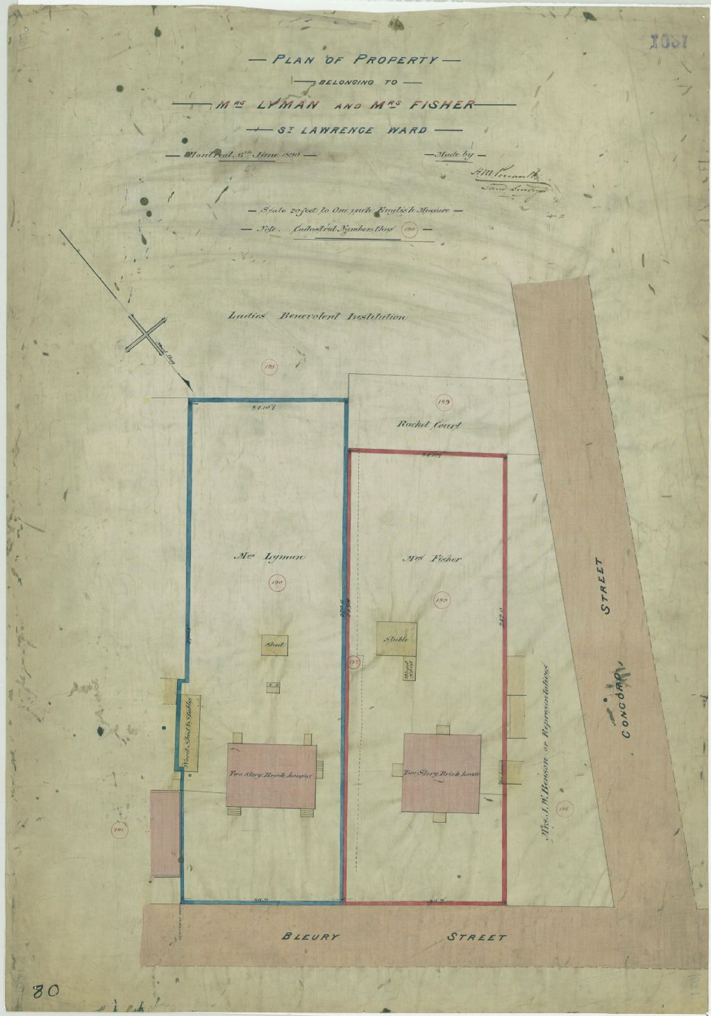 Ce plan présente les lots n° 189 et 190 du cadastre du quartier Saint-Laurent de la cité de Montréal. Ces lots appartiennent à Mesdames Lyman et Fisher. Ces lots sont situés à l'intersection des rues Bleury et Concord à Montréal. Les lignes de divisions des lots sont corrigées.Sont localisés sur le lot n° 189 : une résidence, une étable, une remise, une glacière et le Racket Club; sur le lot n° 190 : une résidence, une remise à bois et étable, une toilette extérieure et une remise. Les voisins sont madame J. W. Benson ou ses représentants et la Ladies Benevolent Institution. Les mesures des lots sont indiquées