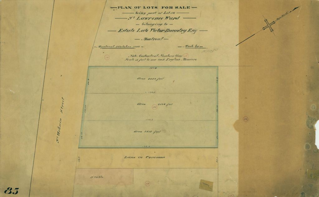Ce plan présente une partie du lot n° 116 du cadastre du quartier Saint-Laurent de la cité de Montréal. Ce lot appartient à la succession de feu Victor Beaudry. Il est situé sur la rue Saint-Urbain à Montréal.Cette partie du lot est subdivisée en trois lotissements. Les mesures et la superficie de chaque lotissement sont indiquées