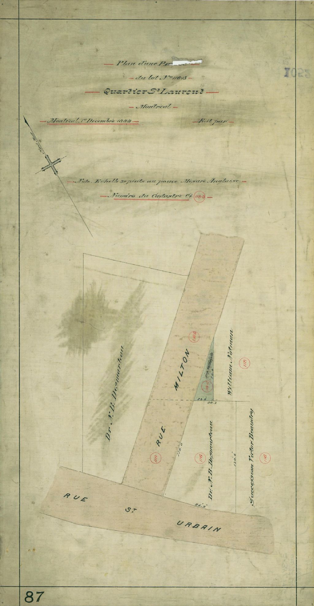 Ce plan présente la subdivision 13 du lot n° 118 du cadastre du quartier Saint-Laurent de la cité de Montréal. Cette partie de lot est située sur la rue Milton près de la rue Saint-Urbain à Montréal.Les voisins sont le docteur N. B. Desmarteau, William Notman et la succession de Victor Beaudry. Les mesures et la superficie de cette partie du lot sont indiquées