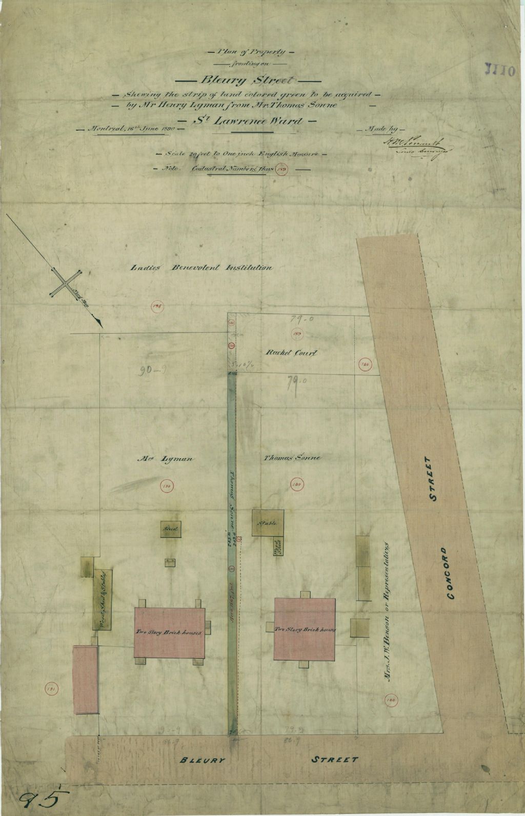 Plan of Property fronting on Bleury Street Shewing the strip of land colored green to be acquired by Mr Henry Lyman from Mr. Thomas Sonne St-Lawrence Ward